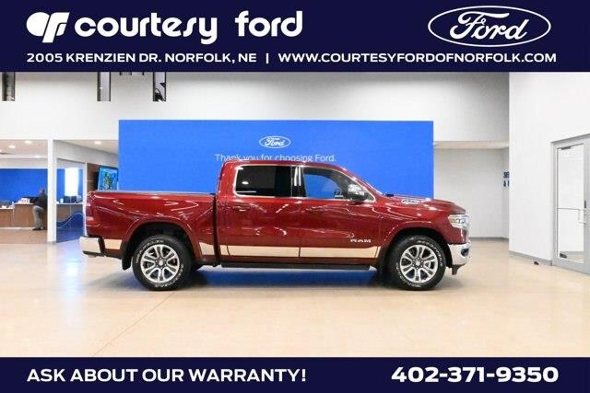 Check out this 2023 Ram 1500 Longhorn before it's too late!*Get Your Money's Worth for this Ram 1500 with These Options *QUICK ORDER PACKAGE 27K LONGHORN -inc: Engine: 5.7L V8 HEMI MDS VVT eTorque, Transmission: 8-Speed Automatic (8HP75), WHEELS: 20 X 9 ALUMINUM PAINTED/POLISHED (STD), TRANSMISSION: 8-SPEED AUTOMATIC (8HP75), TRAILER BRAKE CONTROL, TIRES: 275/55R20 ALL SEASON LRR (STD), MONOTONE PAINT, LONGHORN LEVEL 1 EQUIPMENT GROUP -inc: Adaptive Cruise Control w/Stop & Go, Surround View Camera System, Blind Spot & Cross Path Detection, Parallel & Perp Park Assist w/Stop, LED CHMSL Lamp, ParkSense Front/Rear Park Assist w/Stop, Wireless Charging Pad, Pick-Up Box Lighting, Pedestrian Emergency Braking, MOPAR Spray In Bedliner, harman/kardon 19 Speaker Premium Sound, Power Running Boards, Head Up Display, Tailgate Ajar Warning Lamp, Digital Rearview Mirror, Lane Keep Assist, GVWR: 7,100 LBS, FRONT LICENSE PLATE BRACKET, ENGINE: 5.7L V8 HEMI MDS VVT ETORQUE -inc: Active Noise Control System, Heavy Duty Engine Cooling, Passive Tuned Mass Damper, GVWR: 7,100 lbs, Dual Rear Exhaust w/Bright Tips, HEMI Badge, 18 Aluminum Spare Wheel.*Visit Us Today *Come in for a quick visit at Courtesy Ford of Norfolk, 2005 Krenzien DR, Norfolk, NE 68701 to claim your Ram 1500!