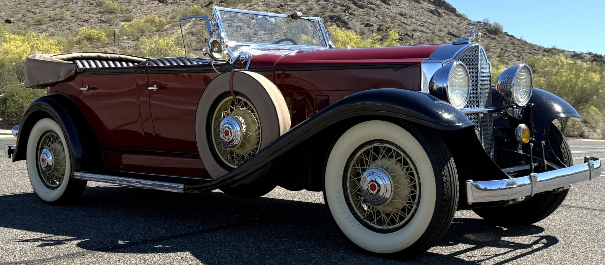 The exterior presentation of this Packard is stately and refined. The long 136.5-inch wheelbase body is straight and well-proportioned, finished in a distinguished tri-tone color scheme of burgundy with darker black character lines and black fenders. The finish remains in good condition with attractive depth and gloss, while the yellow-painted chrome spoke wheels display some light rust consistent with age. Dual side-mounted whitewall spares, dual spotlights, a rear-mounted trunk rack, and the signature Goddess of Speed radiator mascot complete the cars imposing and authentic presentation. The new tan broadcloth convertible top and cover are in excellent condition, fitted to the original wood and chrome top frame, which may benefit from minor maintenance.