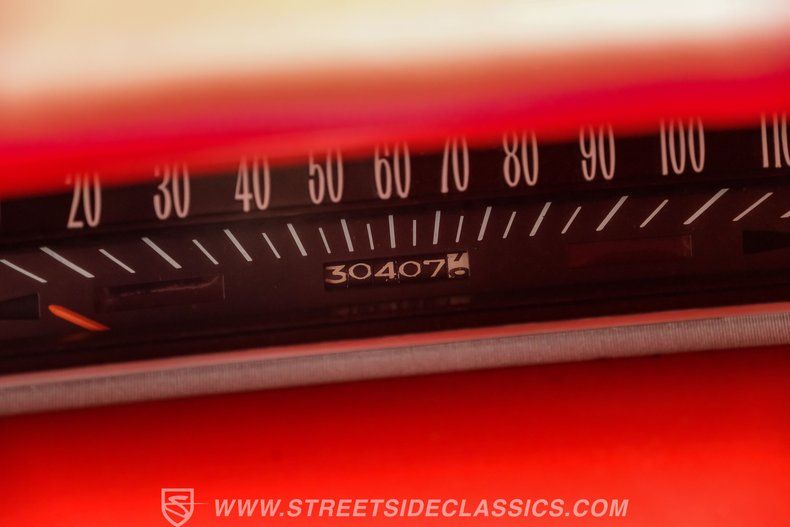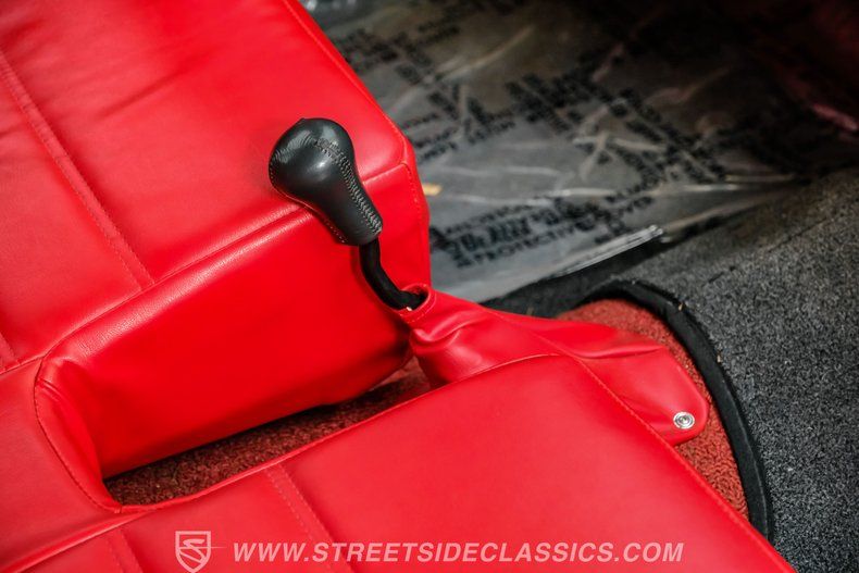 Step inside and you'll find a vibrant red vinyl bench interior that perfectly captures the era's flair while offering modern comfort. The matching door panels and factory red dash set the tone for an inviting cabin, accented by a column-mounted tachometer and under-dash Equus gauges. The custom touches, including the Air Ride Technologies controller and a floor shifter for the six-speed manual, blend seamlessly with the original design. The white vinyl headliner and molded seats make for a comfortable ride, while the digital air ride controls add a cool, contemporary touch.