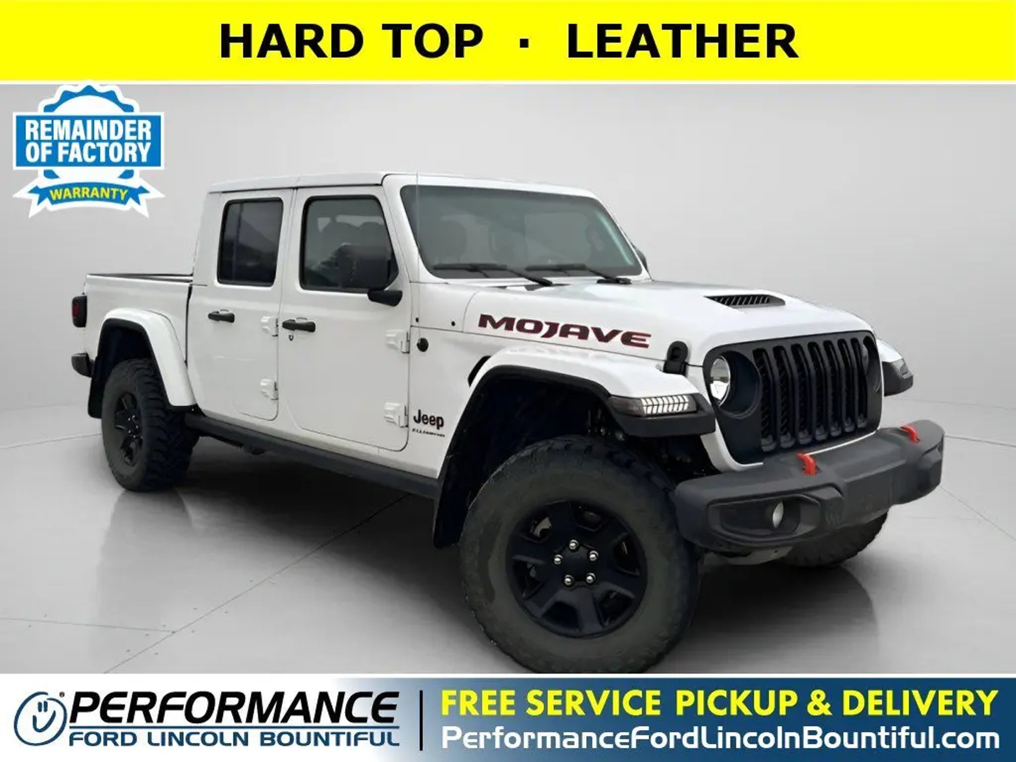 This *2023 Jeep Gladiator Mojave* is loaded with convenient features like HARD TOP, LEATHER, TRAILER TOW PKG, BLUETOOTH, APPLE CARPLAY, NAVIGATION, BACKUP CAMERA, ANDROID AUTO, HEATED SEATS, ALLOY-WHEELS, FOG LAMPS, Remote Entry.This stunning *2023 Jeep Gladiator Mojave* features a beautiful *White* exterior and a *Black* interior.Compare, adjust and save your payment options on every vehicle in stock at: PerformanceFordBountiful.com*Technology and Entertainment Features Include:* Infotainment System, Navigation System, Garage Door Opener, SiriusXM Satellite Radio, Bluetooth Connection and Heated Steering Wheel, Automatic Climate Control, Leather Wrapped Steering Wheel, Compass, Telescoping Wheel, Steering Wheel Audio Controls, Air Conditioning, Rear Reading Lights, Illuminated entry, Bucket Front Seats, Auto Dimming R/V Mirror, Center Console Storage, Multi-zone Climate Control, Vanity Mirrors, Rear Window Defroster, Tilt Steering Wheel, Center Armrest, Trip Odometer, Outside Temperature Gauge, Split Folding Rear Seat, Reading Lights.*Safety and Economy Features Include:* Back-Up Camera, Electronic Stability Control, Brake Assist, Aftermarket Anti Theft System, Emergency SOS system, Security System, ABS Brakes, Dual Air Bags, Delay-off headlights, Rollover Protection System, Tire Pressure Monitoring System, Low tire pressure warning, Passenger Air Bag Sensor, Driver Front Side Impact Air Bag.This vehicle has an EPA rated fuel economy of 22.0 highway / 17.0 city1.Performance Ford Lincoln Bountiful proudly offer our customers at-home services including *Performance Valet*! When you purchase from Performance Ford Lincoln Bountiful, you will be eligible for *FREE Pickup & Delivery*^ for your future service appointments! We value your time and that's why want to give you the best buying and service experiences in Bountiful! Also, ask your product specialist about our home test drives and deliveries. Save time and money through our exclusive Performance Remote Services! Distance limitations may apply.Our dealership is conveniently located off Exit 315 on I-15, North of Salt Lake City. We proudly serve the communities of Bountiful, Centerville, North Salt Lake, Farmington, Salt Lake City, Kaysville, South Salt Lake, Layton, Canyon Rim, Millcreek, West Valley City, Murray, Holladay, Taylorsville, and Syracuse. As a proud member of the family-owned Performance Automotive Network, we have access to thousands of new and used vehicles. This gives us the ability to find the perfect vehicle to fit your needs and budget.*Need financing assistance?* Our strong, group-wide relationships with several lending institutions allow us to offer the most competitive rates! We will give you top-dollar for your trade or make you a cash offer if you'd prefer the convenience of selling directly.With our aggressive pricing strategy, most vehicles sell within the first few weeks, so please contact us ahead of time at * * to ensure the vehicle is still available and ready for your test drive.*We'll Put A Smile On Your Face! *1Based on EPA mileage ratings. Use for comparison purposes only. Your mileage will vary depending on driving conditions, how you drive and maintain your vehicle, etc.*Terms and conditions of warranties vary by brand and vehicle. See dealer for complete details or sign in to download a copy of your vehicle's warranty. Warranty may be restricted or denied if your vehicle or part has been modified, improperly maintained or removed.Delivery to door for Test Drive.