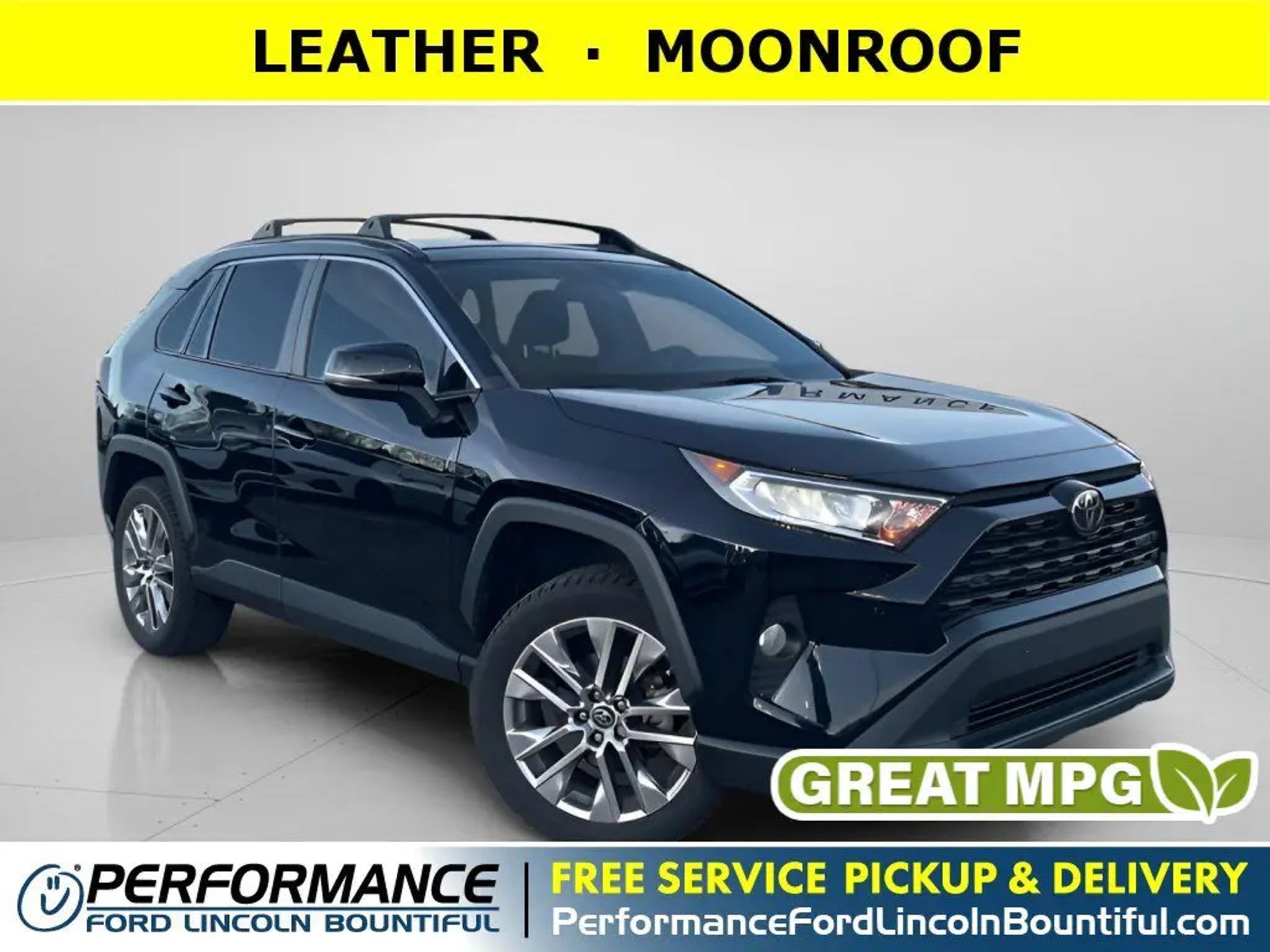This *2019 Toyota RAV4 XLE Premium* is loaded with convenient features like LEATHER, MOONROOF, POWER LIFTGATE, APPLE CARPLAY, BACKUP CAMERA, ALLOY-WHEELS, FOG LAMPS, POWER SEAT, Remote Entry.This stunning *2019 Toyota RAV4 XLE Premium* features a beautiful *Black* exterior and a *Black* interior.Compare, adjust and save your payment options on every vehicle in stock at: PerformanceFordBountiful.comAutomatic Climate Control, Power Moonroof, Air Conditioning, Bucket Front Seats, Steering Wheel Audio Controls, Telescoping Wheel, Illuminated entry, Rear Seat Center Armrest, Multi-zone Climate Control, Center Console Storage, Split Folding Rear Seat, Outside Temperature Gauge, Overhead Console, Vanity Mirrors, Rear Window Defroster, Trip Odometer, Reading Lights, Center Armrest, AM/FM Stereo, Tilt Steering Wheel.*Safety and Economy Features Include:* Back-Up Camera, Electronic Stability Control, Brake Assist, Integrated Turn Signal Mirrors, Delay-off headlights, Knee AirBag, Tire Pressure Monitoring System, ABS Brakes, Dual Air Bags, Overhead airbag, Speed Sensitive Power Steering, Auto Highbeams, Low tire pressure warning, Passenger Air Bag Sensor, Driver Front Side Impact Air Bag.This vehicle has an EPA rated fuel economy of 35.0 highway / 26.0 city1.Performance Ford Lincoln Bountiful proudly offer our customers at-home services including *Performance Valet*! When you purchase from Performance Ford Lincoln Bountiful, you will be eligible for *FREE Pickup & Delivery*^ for your future service appointments! We value your time and that's why want to give you the best buying and service experiences in Bountiful! Also, ask your product specialist about our home test drives and deliveries. Save time and money through our exclusive Performance Remote Services! Distance limitations may apply.Our dealership is conveniently located off Exit 315 on I-15, North of Salt Lake City. We proudly serve the communities of Bountiful, Centerville, North Salt Lake, Farmington, Salt Lake City, Kaysville, South Salt Lake, Layton, Canyon Rim, Millcreek, West Valley City, Murray, Holladay, Taylorsville, and Syracuse. As a proud member of the family-owned Performance Automotive Network, we have access to thousands of new and used vehicles. This gives us the ability to find the perfect vehicle to fit your needs and budget.*Need financing assistance?* Our strong, group-wide relationships with several lending institutions allow us to offer the most competitive rates! We will give you top-dollar for your trade or make you a cash offer if you'd prefer the convenience of selling directly.With our aggressive pricing strategy, most vehicles sell within the first few weeks, so please contact us ahead of time at * * to ensure the vehicle is still available and ready for your test drive.*We'll Put A Smile On Your Face! *1Based on EPA mileage ratings. Use for comparison purposes only. Your mileage will vary depending on driving conditions, how you drive and maintain your vehicle, etc.*Terms and conditions of warranties vary by brand and vehicle. See dealer for complete details or sign in to download a copy of your vehicle's warranty. Warranty may be restricted or denied if your vehicle or part has been modified, improperly maintained or removed.Delivery to door for Test Drive.