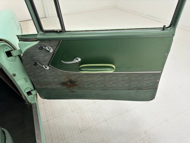 Authentic patterning in the cloth panel of the inner door confirms this may in fact be the original interior as stated by the consignor and there's a tear in the passenger door revealing the underlay. Other than that major rip, the door panels have patina but are in decent condition. The seats take that patterned cloth and surround it with green vinyl on the split bench front seat which has some detachment at the shell, some fading of the cloth, and several tears and holes. The rear bench fares better but shows usage while the sidewalls look good and are topped with a scalloped trim piece. Two-Ten is scripted on the center cap of the green steering wheel which leads to the two tone green dash, somewhat obscured by the tachometer that is mounted on the column, just in front of the speedometer which is flanked by a simple fuel gauge and temperature gauge. An AM/FM/Cassette radio veers from originality in the center of the dash as does the gauge pod under it. A square clock is embedded on the passenger side of the dash which curves around to meet the door beyond the A-pillar. A Hurst Indy shifter is floor mounted and the linkage is not booted but is surrounded by green loop carpet which shows some wear and age and while the headliner is intact, it does look tired. We note that the original column shifter arm is still present but is no longer connected. The trunk is completely uncovered and houses a spare and plenty of patina.