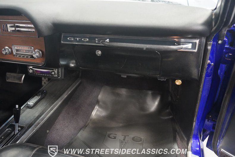 Lowering the power-activated black convertible top reveals a restored black GTO interior that features bucket seats, console, floor shifter, tilt steering column, 3-spoke wood-rimmed steering wheel, Dakota Digital gauges and a Kenwood AM/FM/CD player with remote and two extra speakers in the back seat.