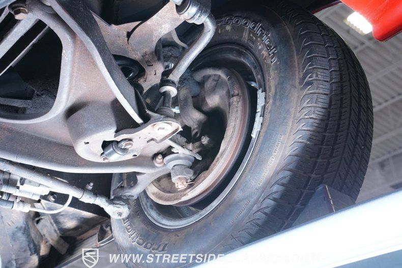 This 1963 Chevrolet Corvette Convertible is a true American icon, sporting the classic body design that made it a legend. Riverside Red paint gleams across its sculpted body, a color that perfectly captures the era's bold spirit. Chrome bumpers and door handles add a touch of class, while the hood vents give it an aggressive edge. The tan vinyl convertible top provides a stylish contrast, ready to drop immediately for open-air cruising. Rolling on 15" American Racing wheels wrapped in 205/70R15 front and 215/70R15 rear tires, this Corvette's stance is classic and commanding.