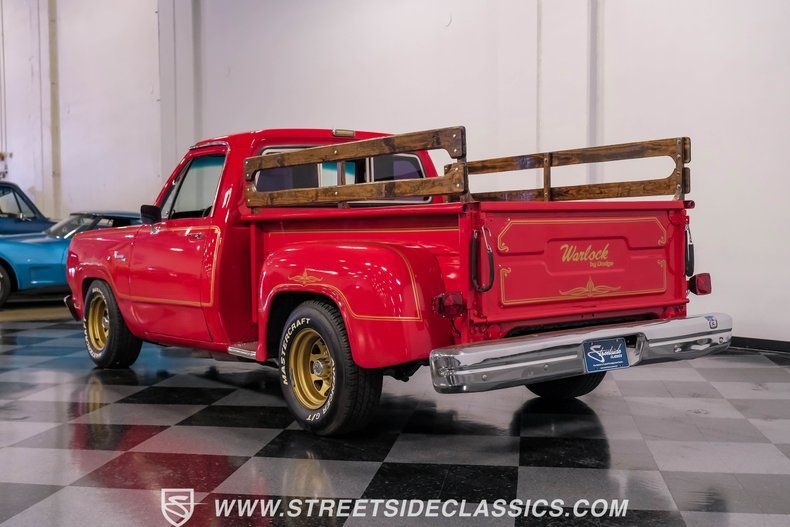 This 1979 Dodge D150 Warlock Tribute showcases a bold red paint job. Gold decals adorn the body, paying tribute to the iconic Warlock design. The truck rolls on 15" gold-painted rims wrapped in Avenger G/T 235/70R15 tires. A real wood bed adds authentic utility, while a sliding rear window and new front bumper complete the exterior upgrades. This D150's transformation from stock to custom creates a unique blend of classic truck styling and modern flair.