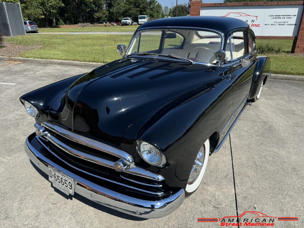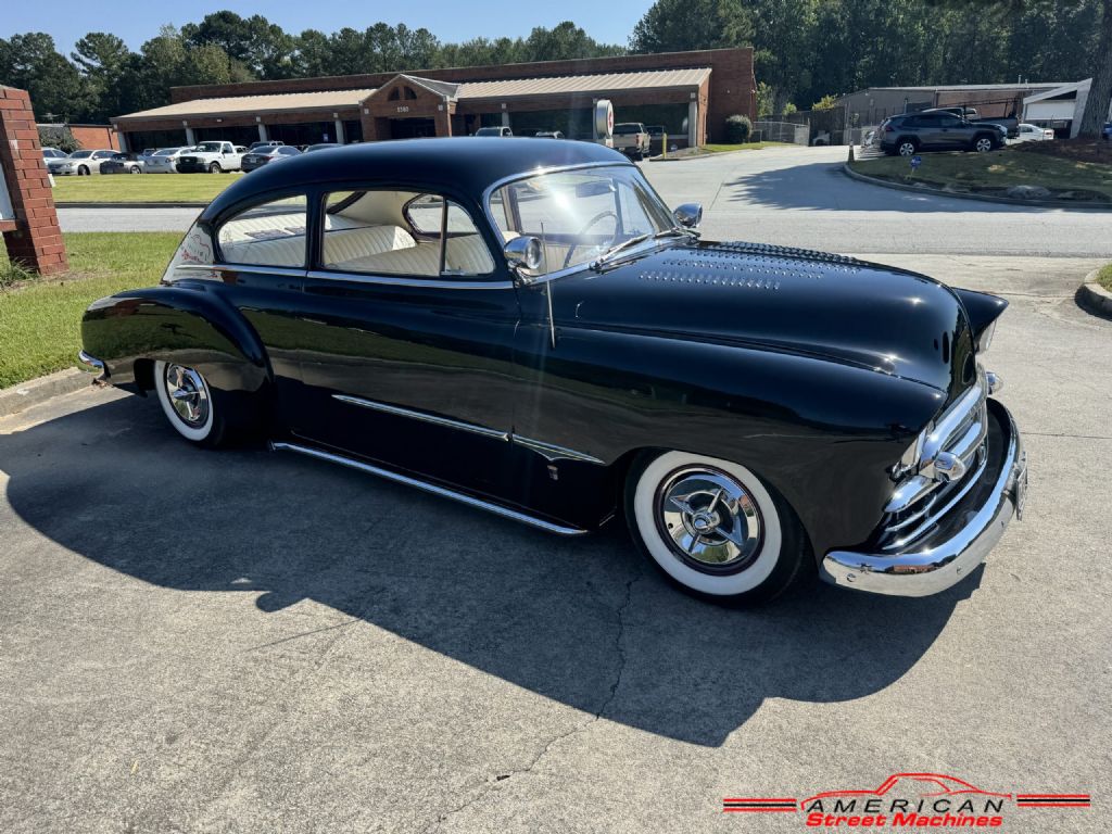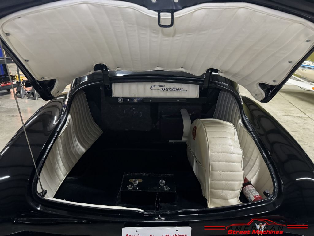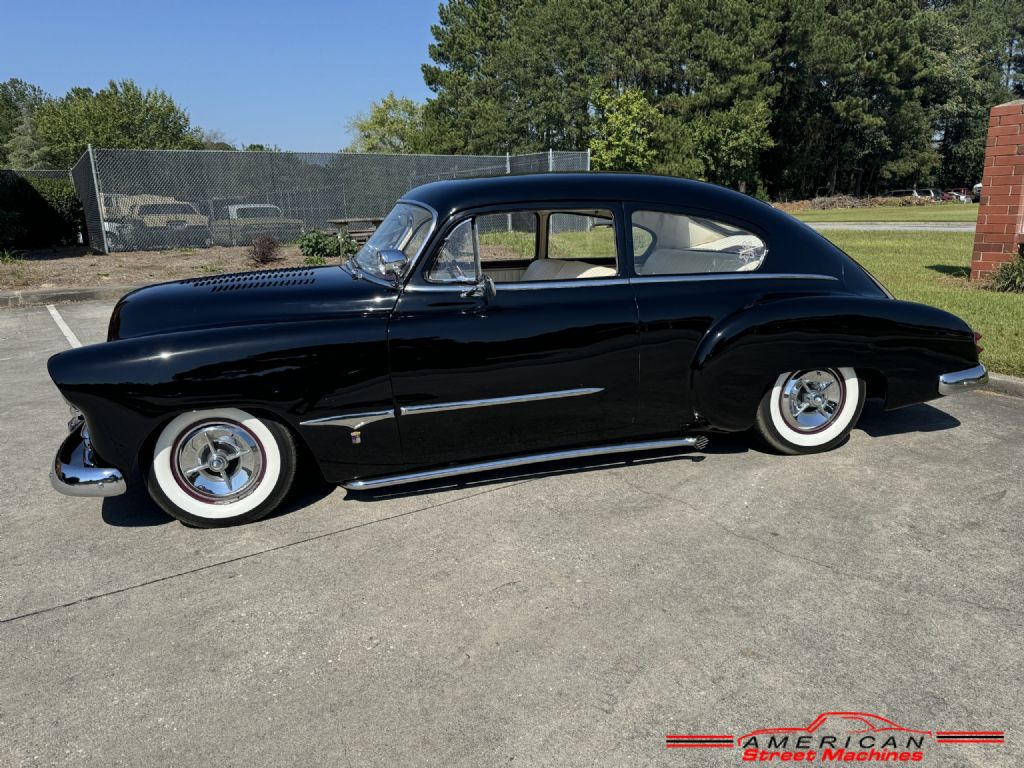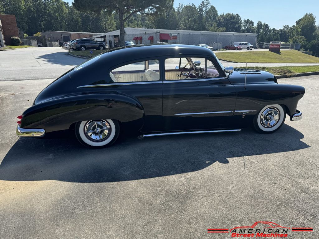 You are looking at a super cool 1950 Chevy Fleetline custom. This car is full of Barris Kustoms details and badged as a George Barris car. Built sometime in the 80's and is still in excellent condition. Slick Black lacquer paint with a few chips her and there but over all very nice. Custom white pleated inteior with purple dash and accents. Built 327 V8 with a turbo 350 3 speed automatic transmission. Full custom detail include: shaved door handles, louvered hood, frenched tail lights