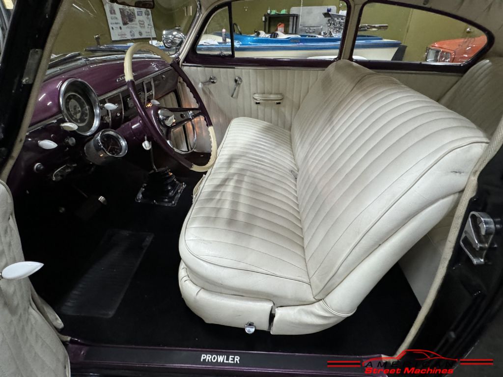 ntenna, air lowering system with pump, lake pipes, relocated fuel fill, custom switches, custom spiked shifter boot with loker floor shifter, interior and exterior Barris Kustoms emblems and paint work, classic Barris etched glass, wide white walls with classic spinner caps. Tjis car is named Prowler. We have done a bit of research to find this car in the Barris Kustoms list online and could not find anything. After many phone calls it turns out this car was supposedly one of his personal cars. Since this iconic car builder is no longer with us we have know way to prove this! If this is one of George Barris's personal cars it sure is a great piece of custom car building history! Either way a super cool car that will bring attention anywhere it goes.