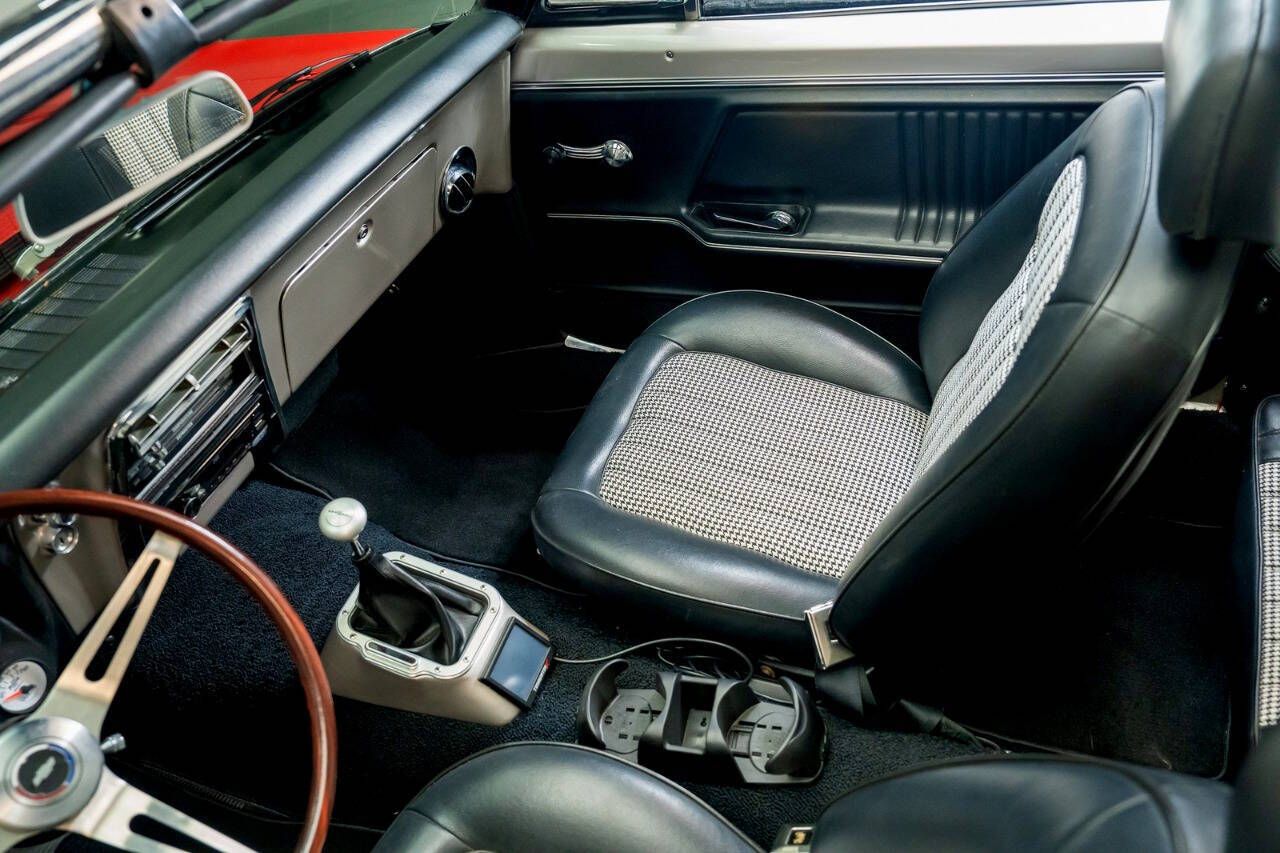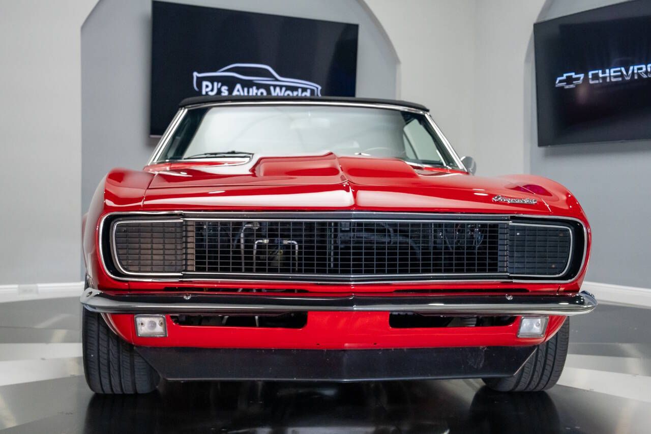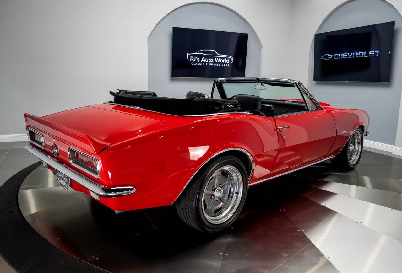 PJ's Auto World is pleased to offer this Pro Touring 1967 Chevrolet Camaro Convertible for Sale. Blue Printed 383 436 Horsepower crate engine (Part #BP38318CTF1), CVF accessory drive, Holley Terminator fuel injection, Griffin aluminum radiator, electric fans, body-off restoration with painted engine bay and underside, VanNatta Fabrication engine bay panels, rack and pinion power steering, built 4L60 overdrive transmission, cold air conditioning, ceramic coated headers, stainless steel dual exhaust with X pipe, TCI subframe adjustable coil over shocks, 4-link rear suspension, QA1 adjustable shocks, 12-bolt posi rearend with 3.36 gears, 4-wheel power disc brakes, 17 American Racing Salt Flat Wheels, beautiful red exterior, Cowl Hood, CVF hood hinges, hideaway headlights, rear deck spoiler, driver's chrome mirror, updated wipers with concealed wiper motor, black canvas convertible top, black Deluxe Houndstooth interior, upgraded front bucket seats, AutoMeter Gauge cluster, Lokar Shifter, Deluxe wood steering wheel, chrome tilt steering column, JVC radio with upgraded sound system. The builder of this car invested years of time, love, and dedication to build this incredible machine! This car has the best parts and was built with an open checkbook. If youre looking for an incredibly Unique and Cool Muscle Car that will turn heads anywhere it goes, let your search stop here! This powerful Classic mixes the best virtues of Modern Hot Rodding with the timeless style of Detroit Muscle. Call us today, and start making memories! With over 45 years of dedicated service to the Collector Car Community, our team is eager to answer any questions you may have. Finance options available and worldwide shipping can easily be arranged. Interesting trade-ins will also be considered.