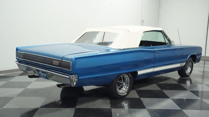 This '67 Coronet 440 ragtop brings serious muscle, being one of just 6,604 convertibles built that year. The deep blue paint and razor-sharp white stripes make this Mopar a certified street brawler. Rolling on classic Magnum 500s - 14x6 wrapped in meaty 215/70R14 rubber, this Dodge has the perfect street stance. The premium Coronet 500 rear badges tell other motorists this ain't your average grocery-getter, while the vinyl top drops at a moment's notice when you're ready to feel the wind.