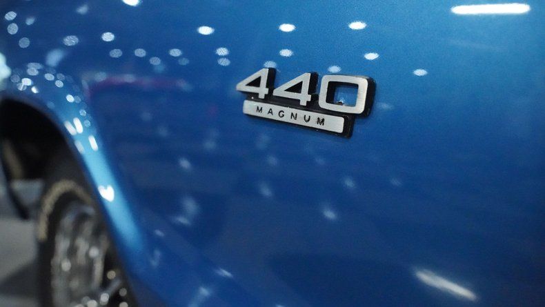 Inside, the blue vinyl cockpit keeps things old-school cool. A factory bench seat gives you plenty of room to operate, while the column-mounted shifter puts the TorqueFlite's muscle right at your fingertips. The original AM radio and beefed-up rear speakers let you bring your own soundtrack. Power steering and power brakes make this bruiser easy to handle when you're cruising or pushing it hard. Factory gauges keep you informed of what's happening under that hood.