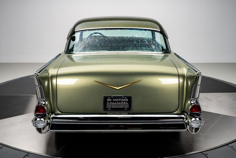 The lines of this '57 Bel Air are nothing short of breathtaking, with an expertly restored and perfected body finished in a custom two-tone green paint that perfectly complements its aggressive stance. Every curve, every detail, has been honed to perfection to create a car that's as visually striking as it is mechanically precise.