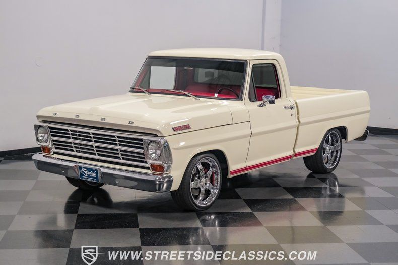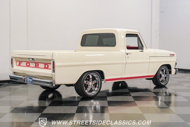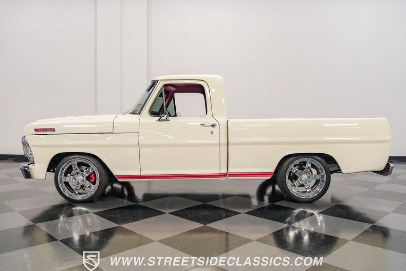 Ford chose 1967 to introduce its next generation of F-Series pickup truck. Designers squared off the body lines and accented the flat side panels with a narrow indentation. Truck interiors were also more "plush," and featured a padded dash, padded sun visors, and seat belts with shoulder anchor harnesses, all as standard equipment. This 1967 Ford F-100 restomod pickup combines Ford's classic styling with modern enhancements to create a one very special truck.
