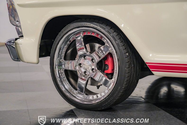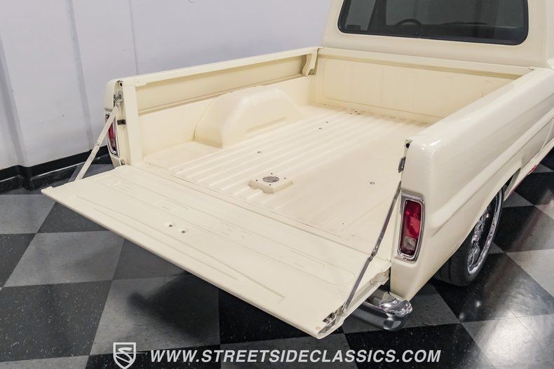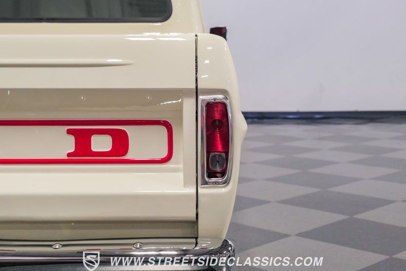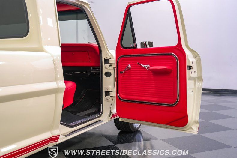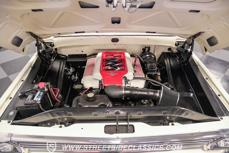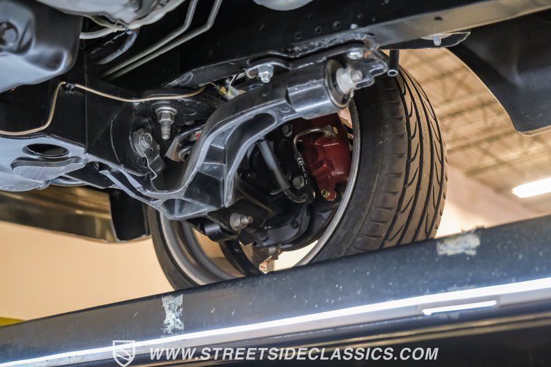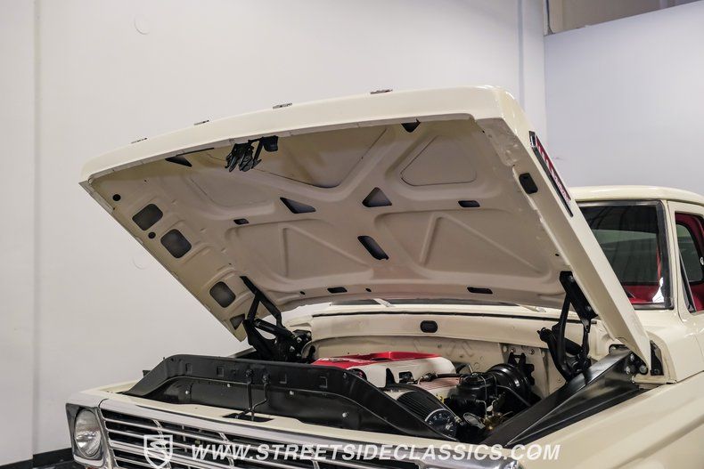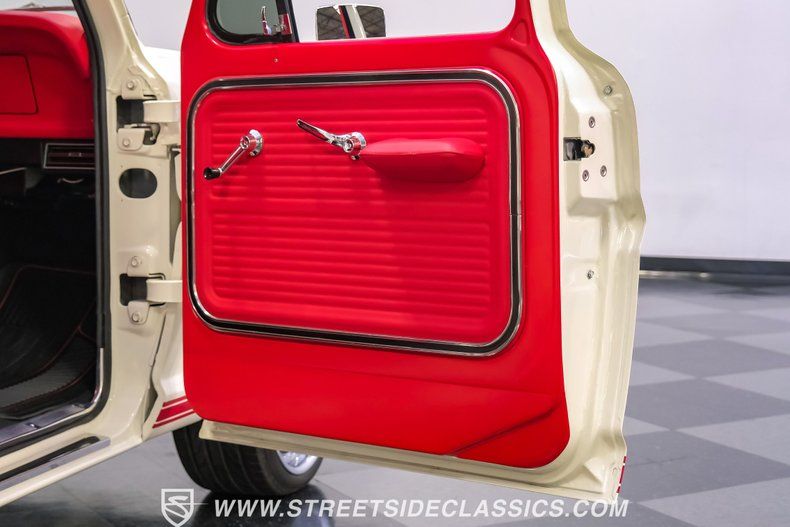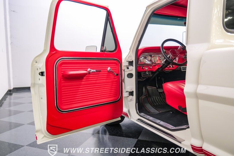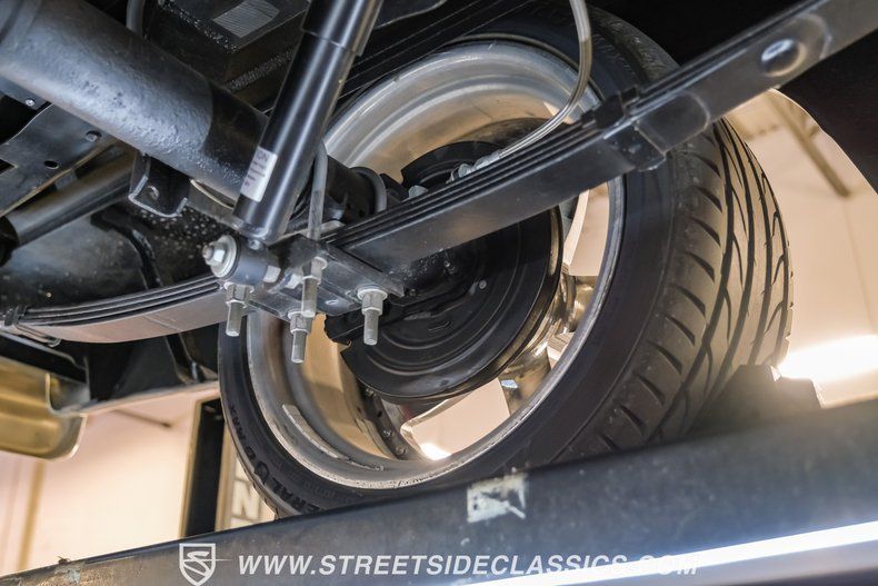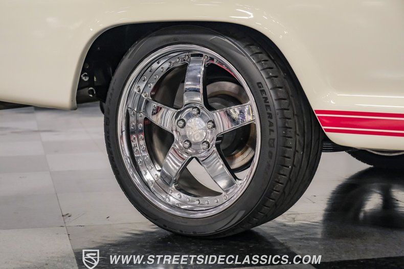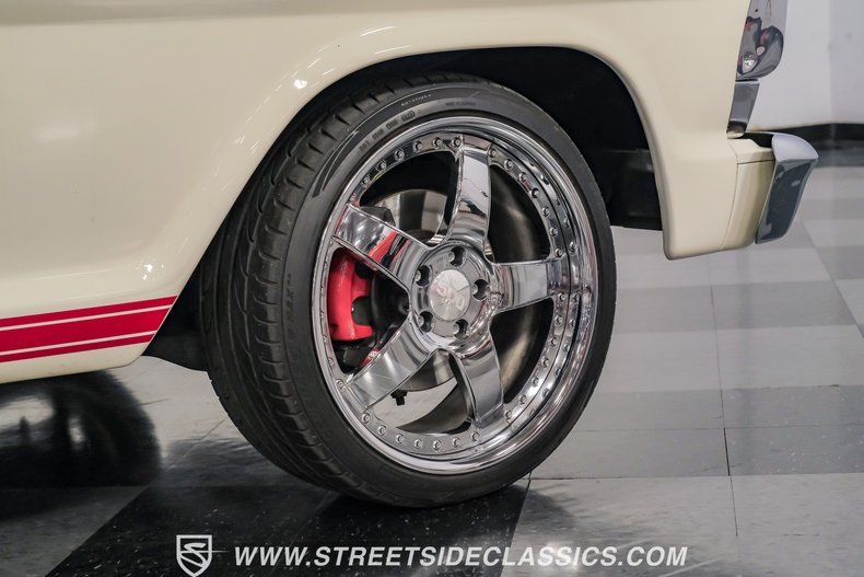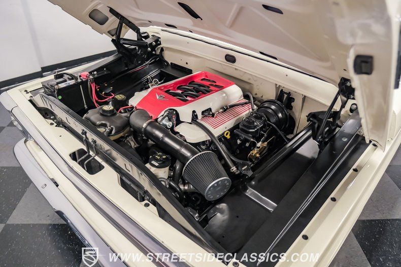 This a high-quality restoration with show-quality Wimbledon White paint laid down on a laser-straight body accented by bright rim, brilliant chrome front and rear bumpers and a red lower Mustang GT-style side stripe that hints of what is under the hood of this classic. Exterior upgrades include a color coordinated Rhino-lined type spray bed finish and a relocated fuel tank with the filler located in the bed. A set of chrome 20-inch BOZE wheels wrapped with General tires staggered 245/35ZR19 front and 285/35ZR19 rear provide a confidant stance.