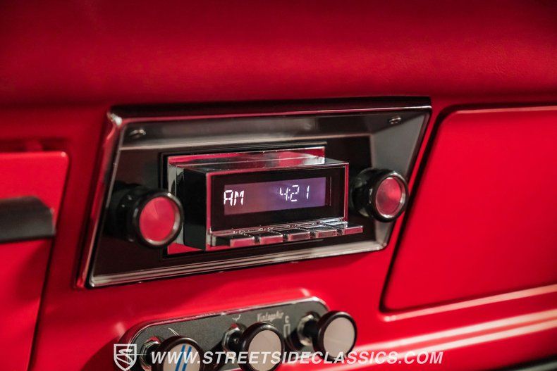 The interior looks amazing. Custom trimmed in red, it features a custom upholstered bench seat with integrated cup holders, Vintage Air, custom gauge cluster with Dolphin gauges, RetroSound AM/FM radio, chrome tilt steering column and a beautiful custom billet and leather steering wheel.