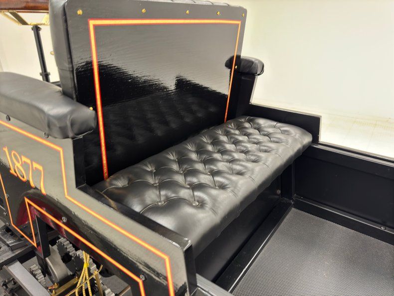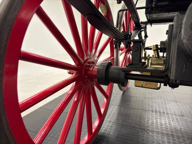 Glossy black paint adorns the wood construction of the Selden with gold trim and graphics that are bordered in red, the perfect complement to the red wood spoked wheels with the rears being larger than the fronts which have a lower axle to accommodate the engine. The visible powertrain wears a coat of shiny charcoal paint with contrasting yellow ignition wires and chunky metal cogged gear wheels that transfer power to the axle. Brass hardware is found throughout the exterior including on the front light posts, valves on the engine, the brake, and wheel hardware. Buggy springs make up the suspension for this motor wagon.