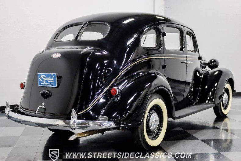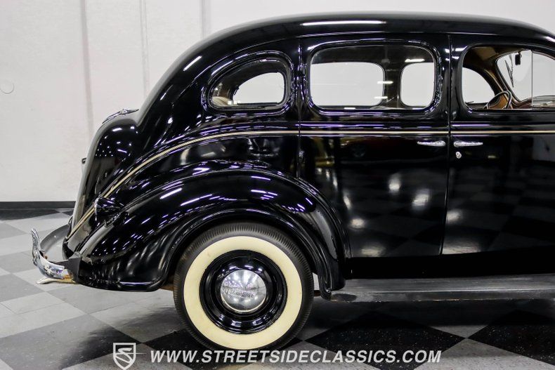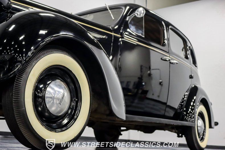 This 1938 Plymouth Deluxe spent 32 years preserved in a South Texas private museum collection until 2023. A survivor with an older repaint, the black exterior still makes quite a bold impression, accented by wide whitewall 6.00-16 Coker Classic tires mounted on 16-inch steel wheels with chrome hubcaps. The painted pinstripes add a custom touch to the classic body lines, while the chrome trim and bumpers display their luster against the dark paint.