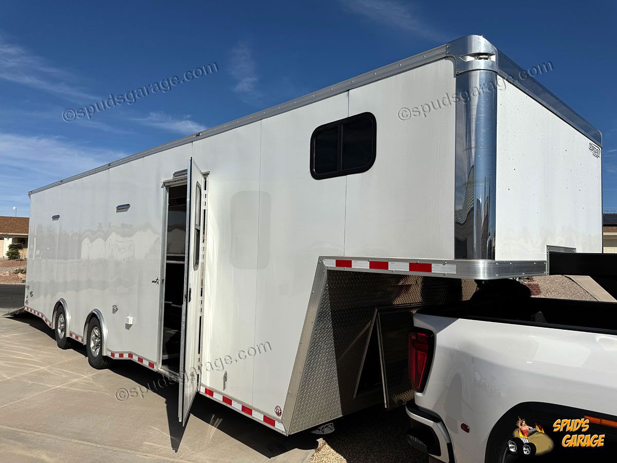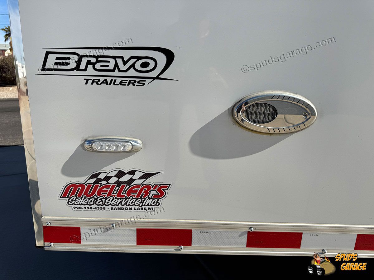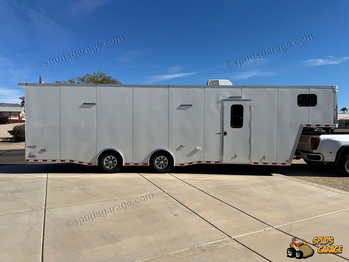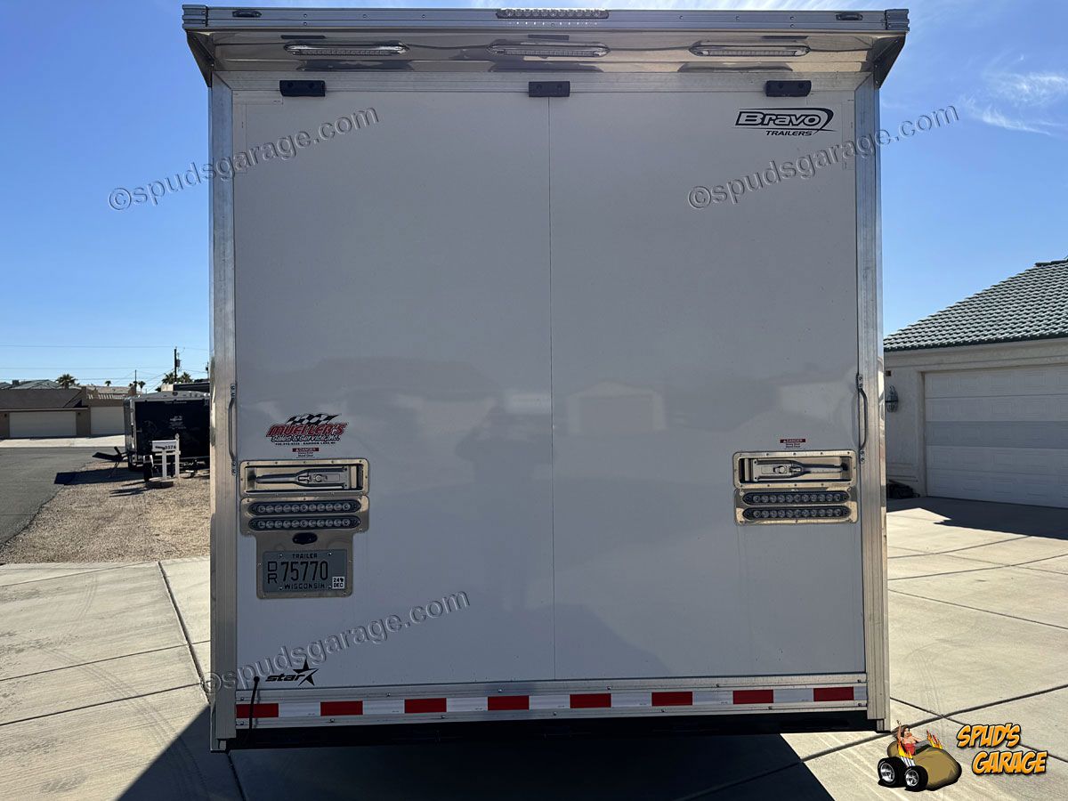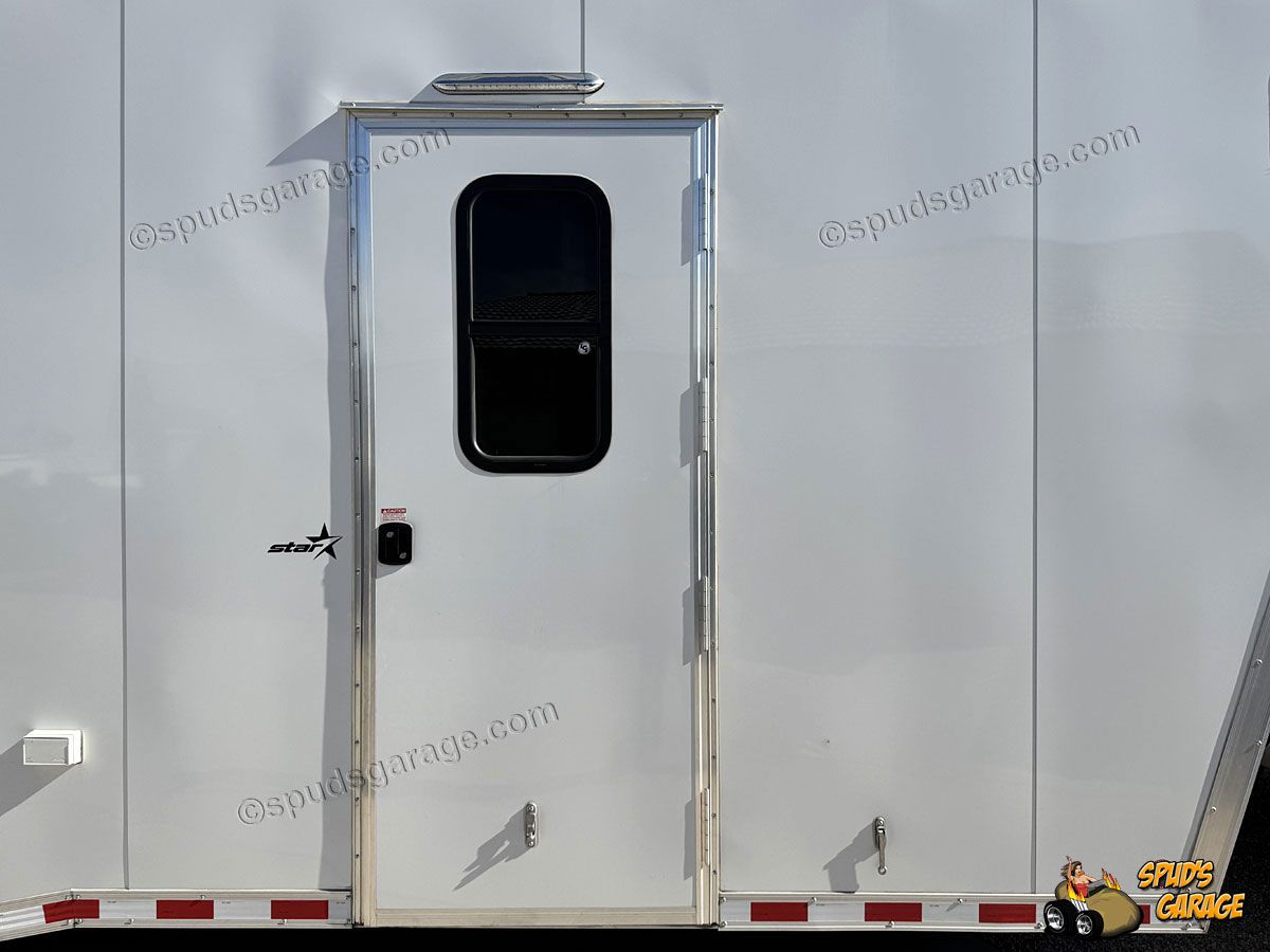 2020 Bravo Super Star 36ft Enclosed Gooseneck Car Trailer, auto-package, Super Star exterior trim package TA, 6+2 forward attic, Super-Spread 7000lb tandem axles 14K GVW, Electric Brakes, Tube Frame, Star Wing 8" roof extension, 12" extra ceiling height, 96" wide w/heavy duty rear deck/ramp, hydraulic landing jacks, extensive LED exterior lighting porch/work/load/etc upgrades, 36" side entry door w/window, 72x48" concession door, (3) floor storage compartments w/spare, interior LED angle lighting, 12/110 electrical package, insulated w/36" carpeted walls, Black Coin vinyl flooring, fold out attic ladder, E-Track wall mounted, 5000# recessed floor D-rings. Owner Upgrades: Air-Conditioning/Heat, Charger, Inverter, Dual Batteries, Power Winch (Limited Use-Like New)