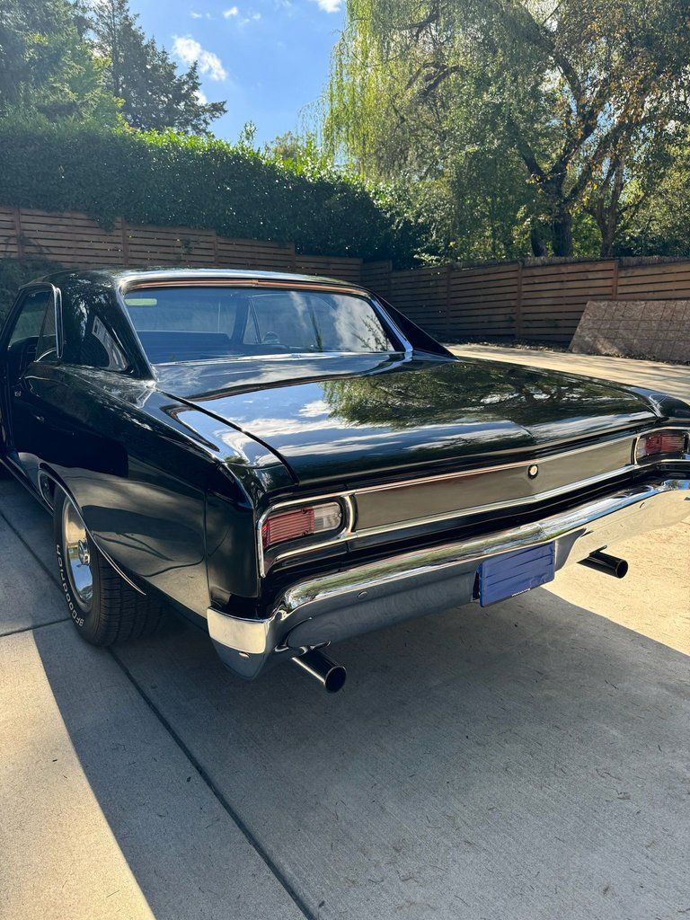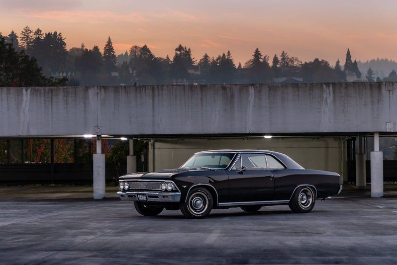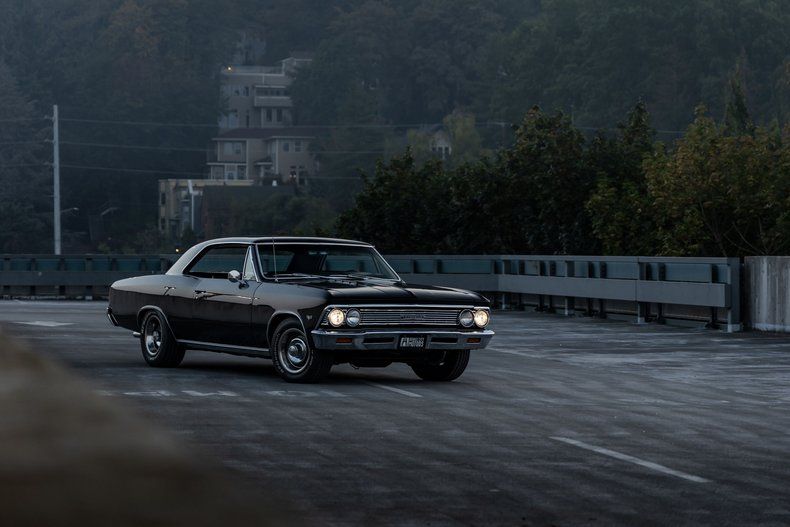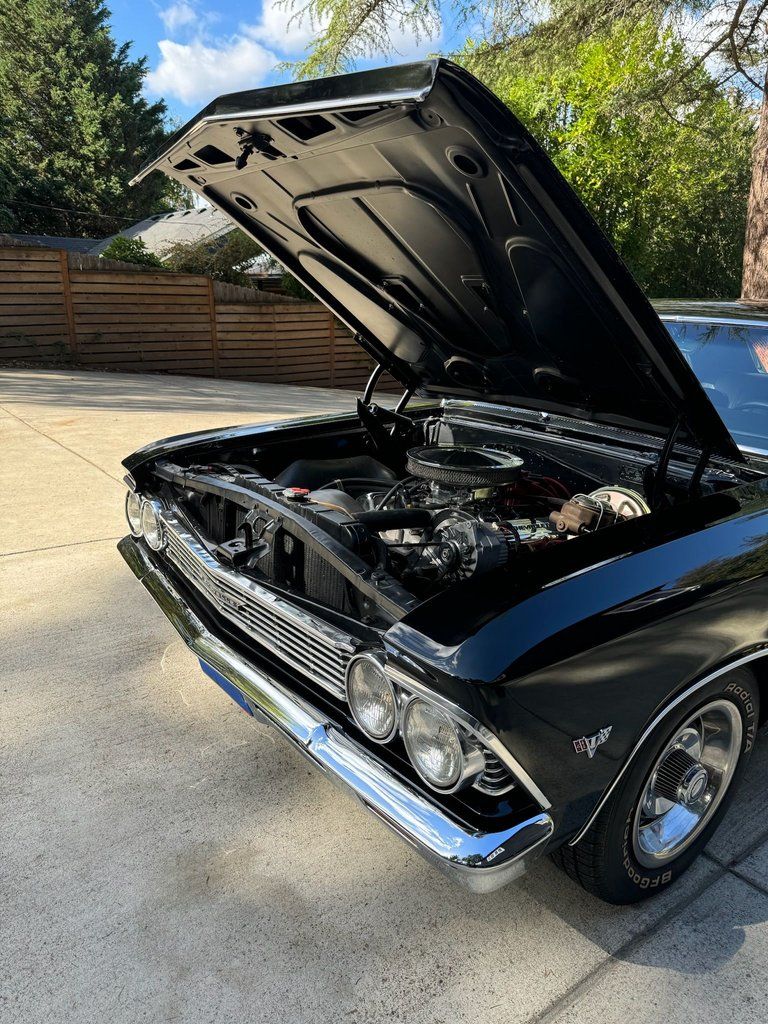 This 1966 Chevrolet Chevelle Malibu sport coupe was refurbished from 2016 to 2023. Work involved installing a BluePrint 383ci stroker V8, refinishing and reupholstering the car in black, and overhauling the suspension and brakes. Equipment includes a three-speed automatic transmission, a 10-bolt Yukon Gear 3.36:1 Positraction limited-slip rear differential, Holley Sniper EFI, exhaust headers, front and rear coilovers, front disc brakes, 15 rally-style wheels, digital readouts, electric windows, a B&M shifter, and an aftermarket stereo