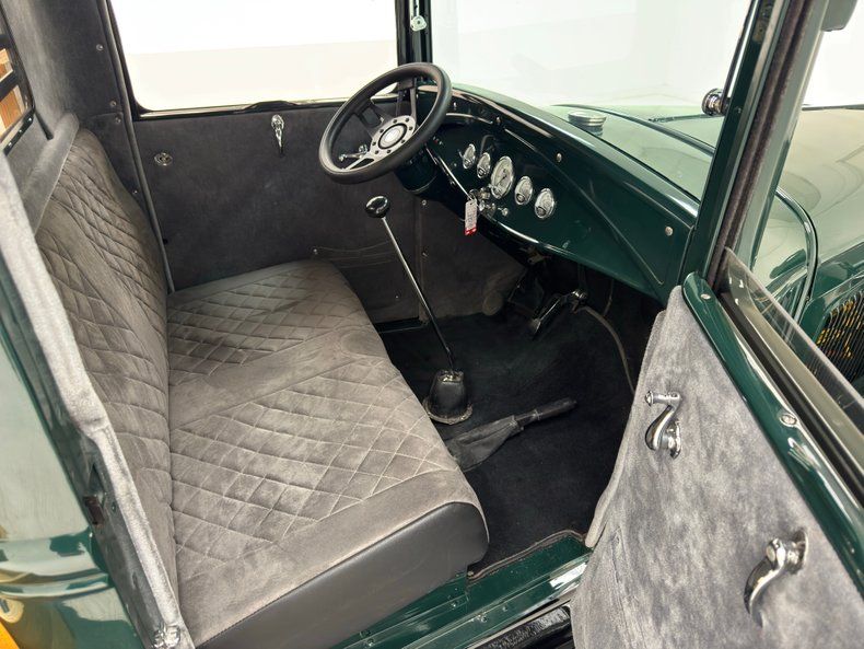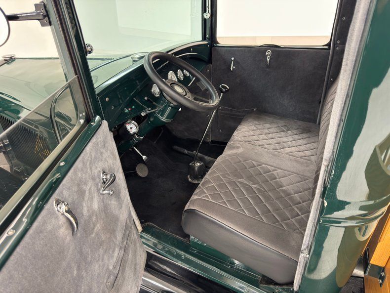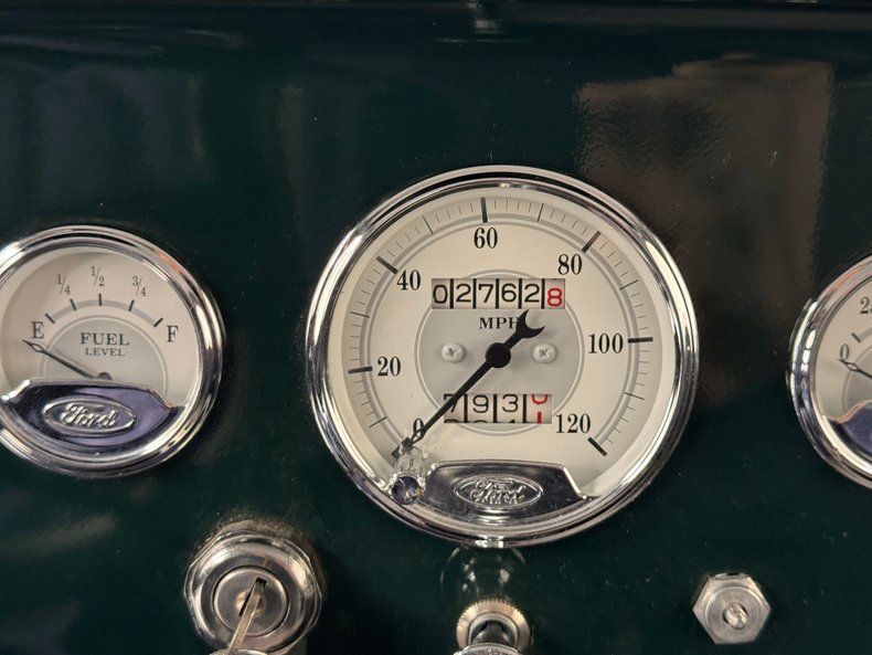 A deep green covers the body and the Valley Green is accented, as cars were in this era, with black fenders and running board which for this stake bed, coordination visually with the substantial black painted frame under the bed. Small amber marker lights front a black grille while a laser straight polished ribbon bumper leads the way. On the cab, a windshield visor keeps the sun out while the rubberized roof keeps out the rain. Oak planks make up the bed and while the stake sides still retain their honey color, the bed itself and other skyward facing pieces are a bit weathered, but fully intact. 15-inch wheels are painted bright yellow and enhanced by trim rings and Ford stamped hubcaps and where you might expect to see dual wheels in back, we have 29x15.5-15LT fat tires. A couple of scratches and a paint chip are the only imperfections we find on the front section of the truck.