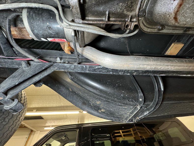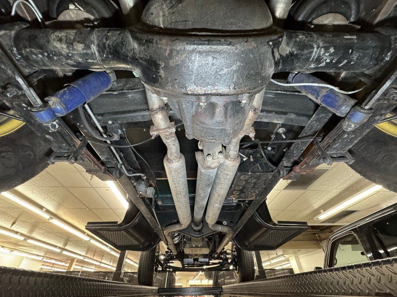 There's some road dirt underneath where things are generally clean with minimal surface rust and no apparent oil leaks. The dual exhaust travels quite a distance before meeting a pair of turbo mufflers, soon after which it terminates under the bed. Suspension consists of a 4 bar with a transverse leaf spring in front and leaf springs in the back.