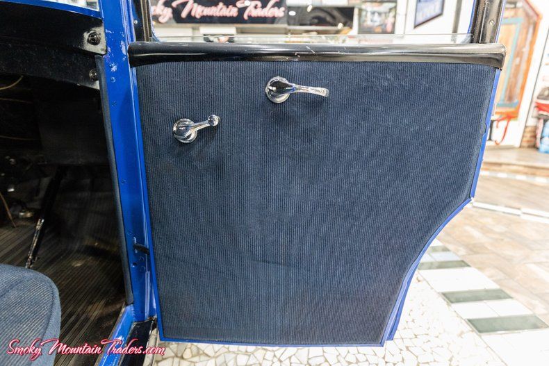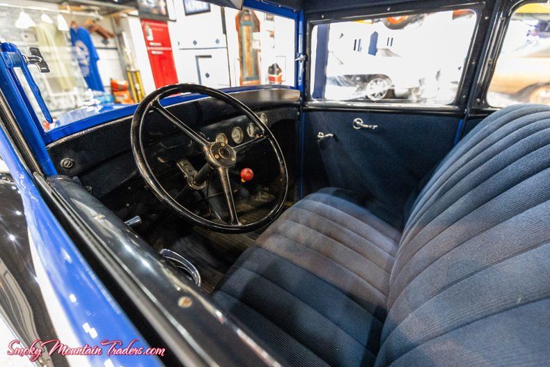 The body has been phenomenally cared for over the years and was redone in the Blue and Black color scheme, accented by the tan stripe down the sides. All the glass is in great condition, and the front windshield tilts out. Both front and rear bumpers are very nice as well. Up front we can see the grill and headlights are very nice, and out back, it has the spare tire and center brake light. It's sitting on the factory-style wheels with Goodyear tires. On the inside, it's done in classic blue with matching seats and door panels. It's got the factory-style steering wheel and rubber American Austin Floor mat. Looking at the dash, all the gauges and metal looks to be in great condition. Under the hood it's powered by the 4 Cylinder 750CC Flat Head Engine. It still has the 6 Volt system. It comes with the standard optioned 3 Speed manual.