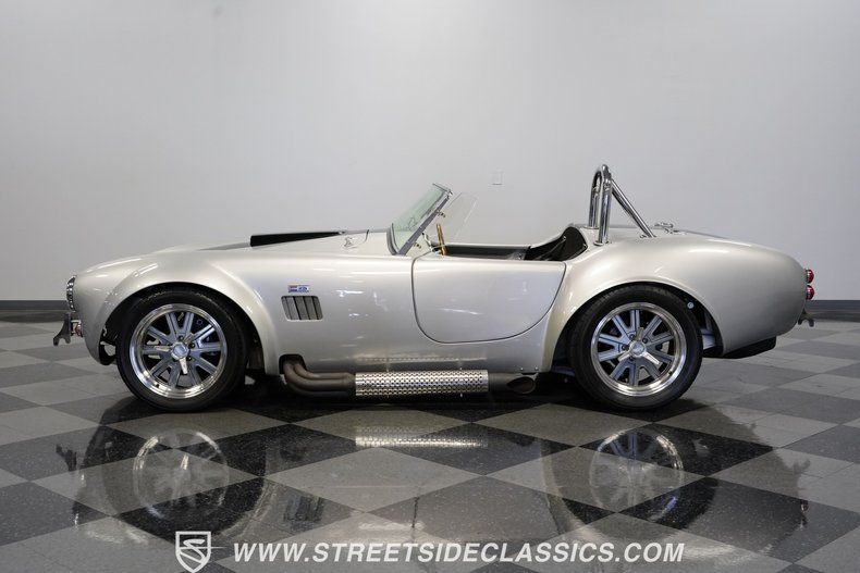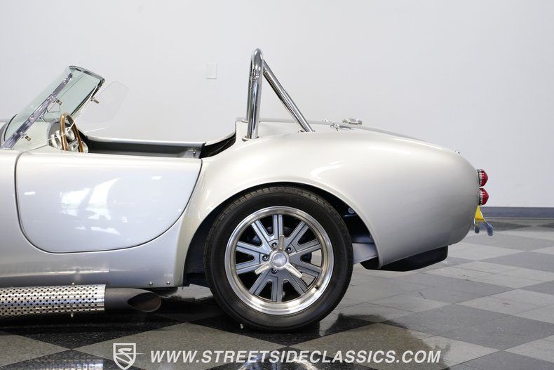 Legendary speed and style define the Shelby Cobra Factory Five, finished in a stunning Silver Metallic paint job with classic black racing stripes running along its body. The low-slung body sits perfectly on 17" American Racing wheels that fill out the wheel wells completely. A functional hood scoop adds motorsport flair to the front end while the side pipes add visual muscle to the overall appearance. The single chrome rollover bar behind the seats adds both safety and style. Yokohama tires (225/40ZR17 front, 285/40ZR17 rear) provide excellent grip.