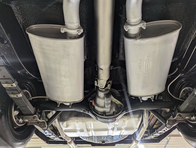 UNDERSIDE: Under this car is restored and detailed, right down to the assembly line markings. The steering and suspension all looks fresh like it's been rebuilt or replaced. The brakes have been serviced, the lines and e-brake look new. It has a factory style dual exhaust system with the correct tips going out the back. The fuel system was replaced including the tank. Looking up at the motor it's very clean, the starter looks fresh. The 727 Torqueflite automatic looks fresh too and a restored driveshaft is going back to the 8 3/4 rear end. The floors and frame rails all appear to be very solid. It has factory applied undercoat certain areas and painted gloss black in others.