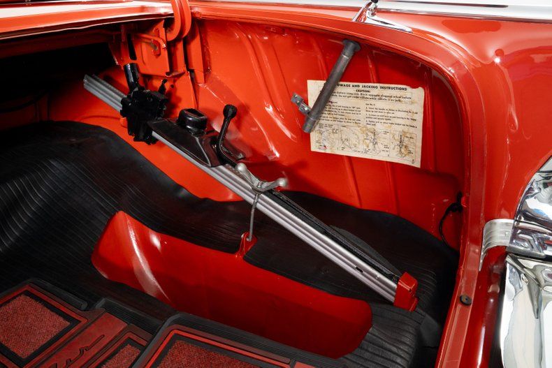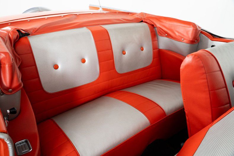 Finished in eye-catching Matador Red with a crisp white power top and period-correct fender skirts, the car's curb appeal is enhanced by a Continental kit, dual rear antennas, and gleaming brightwork from bumper to bumper. The red and silver vinyl interior exudes vintage charm with plenty of room for weekend top-down adventures.