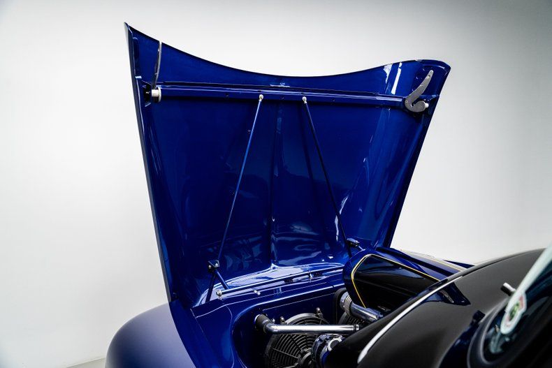 Once the metalwork was verified straight and true, the Roadster Shop laid down a two-tone Black and Blue metallic finish. The contrasting paint is detailed with silver leaf and gray gradient accents, bordered by crisp yellow pinstriping by Rick's Pinstriping. This finish extends into the engine bay, which was treated with the same level of detail and pinstriping.