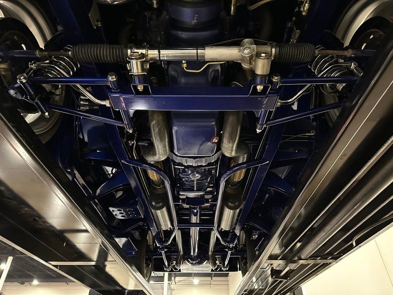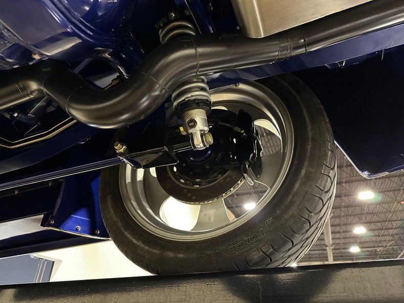 The chassis is a fully custom Roadster Shop Stage III unit, stretched four inches with raised crossmembers and a C-notch for an aggressive stance and clearance. Heidt's Superide independent front suspension is paired with power rack-and-pinion steering, a custom triangulated 4-link rear setup, and QA1 coilovers at all four corners. Stopping power comes from power-assisted Wilwood disc brakes. It rolls on Billet Specialties Rail wheels, 20 inches up front and 22 inches out back, wrapped in BF Goodrich G-Force T/A tires (245mm front, 295mm rear).