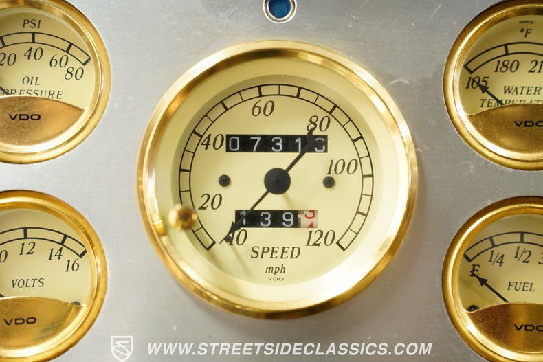 Tan leather bucket seats with console create a comfortable environment that blends classic luxury with modern convenience. The console shifter sits between the seats, while the Kenwood DNX690HD touchscreen display provides AM/FM, Sirius, DVD, and Bluetooth connectivity. Power windows, power locks, and power seats add convenience throughout the cabin. Air conditioning keeps things cool, and the tilt wheel adjusts for driver preference. Wood finish accents the dash alongside newer gold gauges, while the chrome steering column supports an aftermarket steering wheel.