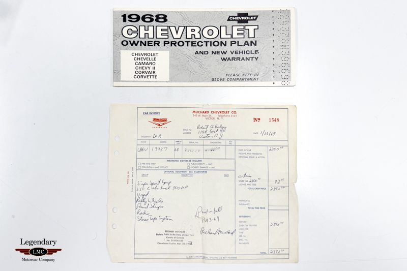 LMC is very proud to offer for sale this 1968 Chevrolet Camaro SS Chevrolet scored a branding coup in 1961 when it introduced the Super Sport option package consisting of heavy-duty suspension, brakes, wheels and tires, interior trim upgrades, and a choice of three performance engines. The message was clear: a Chevrolet bearing the distinctive SS badges was to be taken seriously by the competition. The SS package grew to encompass other Chevrolet models, and, in 1967, it found another natural home in the sporty new Camaro. This 1968 Camaro SS offered here for sale is a time capsule example with only 62,486 miles from new Purchased new by its original owner from Muchard Chevrolet in Victor, New York on May 8th, 1968, this first-gen Camaro has been pampered and under single ownership for over 25 years! The original purchaser owned the car for just over a year before selling it back to Muchard, Chevrolet who sold its long term owner as reflected on the bill of sale. Throughout Mr.Nolan’s ownership he kept the car in incredible mechanical and original cosmetic condition, even keeping every service receipt and as well as registration slips. Under the SS hood lies the numbers matching L48 350ci/295hp backed by the numbers matching M20 four-speed manual transmission. A testament to the original owner’s care, it is still wearing its original Rally Red paint and retains its original Black bucket seat vinyl interior. The undercarriage has been well preserved, still showing many of the original build techniques from the assembly line. The paperwork documenting this Camaro SS is incredible including the Protect-O-Plate, bill of sale, car invoice, registration documentation, ownership history, service history and more! Survivor examples in this condition are incredibly hard to find especially with this amount of documentation! With long term single ownership, outstanding originality and provenance this is an incredible example for any muscle car collector.