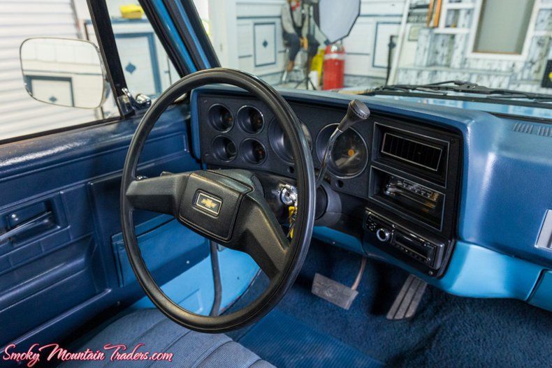 Inside, the truck boasts a stunning two-tone blue interior with a bench seat, original steering wheel, and factory gauges. The dash is in outstanding condition and includes an upgraded radio for modern convenience. It retains its classic charm with standard manual windows and a no-nonsense, functional layout.