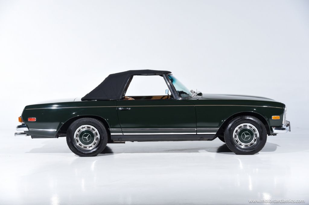 1968 Mercedes-Benz 280SL for sale! Motorcar Classics is proud to present a truly exceptional 1968 Mercedes-Benz 280SL, finished in a striking dark green exterior complemented by a luxurious cognac interior, and paired with a matching dark green hardtop and a black convertible top. This example has undergone a comprehensive restoration to the highest standards, and recent servicing, making it an outstanding investment-grade vehicle for the discerning collector.