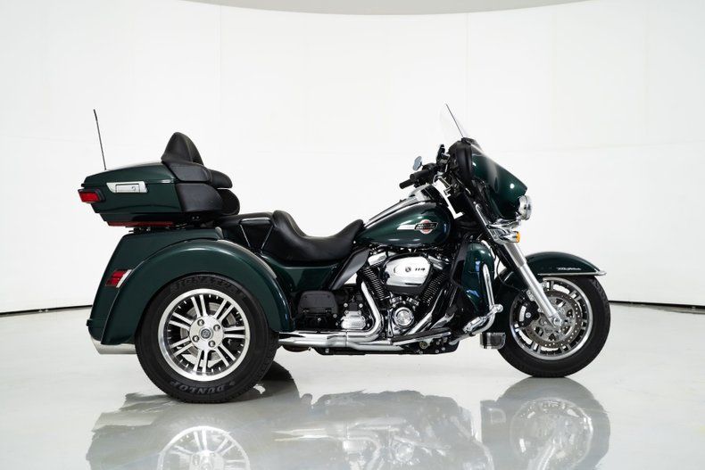 Finished in Alpine Green and Black with black leather seats, this Harley-Davidson trike rides on aluminum wheels wrapped in Dunlop radial tires. With only 2,371 original miles from its single owner, it's barely broken in and ready for the road.