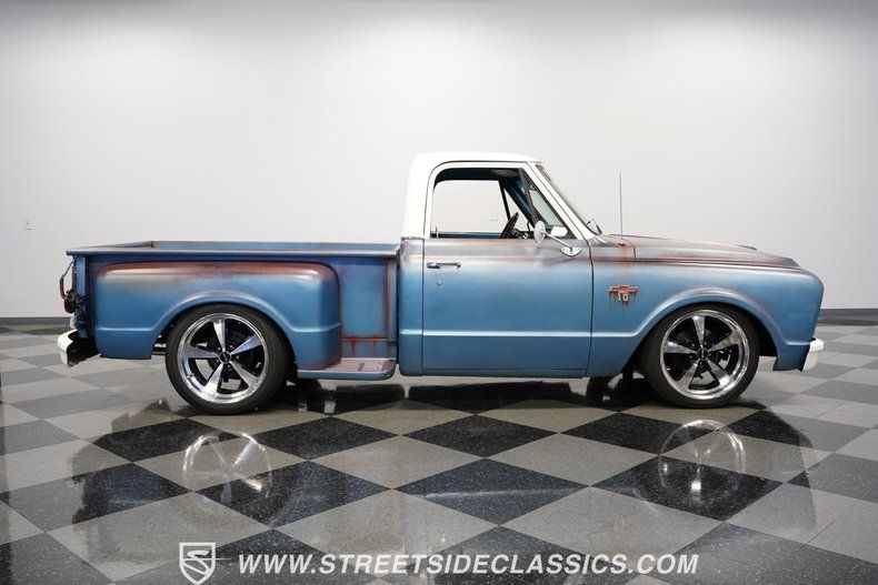 Small back windows were only available for 1967 C10 models, making this Chevrolet C10 Stepside a rare find. Blue patina exterior with white roof and bumpers creates a classic two-tone look that draws admiration from everyone. This lowered profile sits perfectly on 20" Ridler wheels, with 245/40R20 rubber up front and 275/40R20 in rear. Upgraded headlights improve nighttime visibility, while this nicely finished wood bed adds functional style. This C-notched frame allows for that perfect dropped stance without sacrificing drivability.