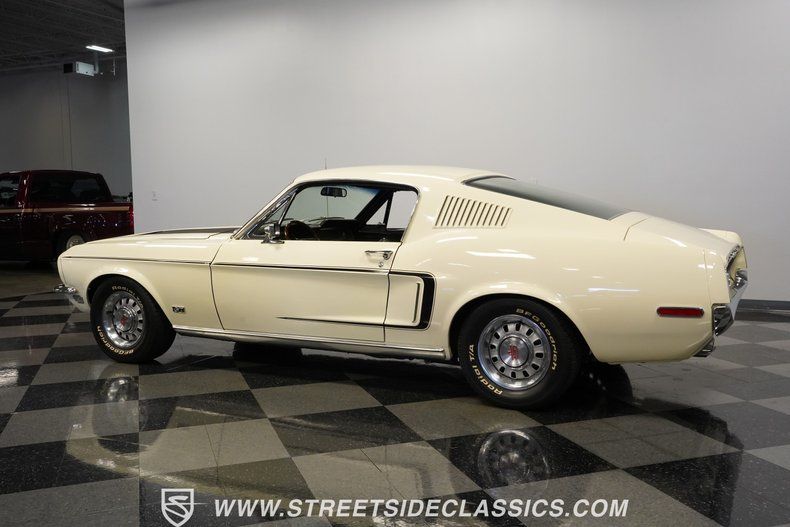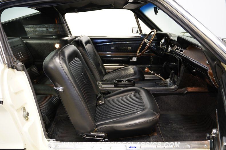 This 1968 Ford Mustang GT J Code Fastback, a true muscle car legend, roars with a Crisp White exterior that gleams under sunlight. The odometer shows just 52,620 and is believed to be original. This rare Mustang was maintained by the same family for four generations, and its outstanding condition reflects the great care it has received over the years. The fastback profile exudes raw power, accentuated by GT fog lights and side louvers that collectors love. Factory GT Mustang styled steel wheels provide a perfect blend of vintage aesthetics and muscle car flavor. The wheels are wrapped with P235/60R14 BF Goodrich Radial T/A tires that provide ample grip for this classic. The GT stripe kit adorns the sides, emphasizing the car's muscular lines.