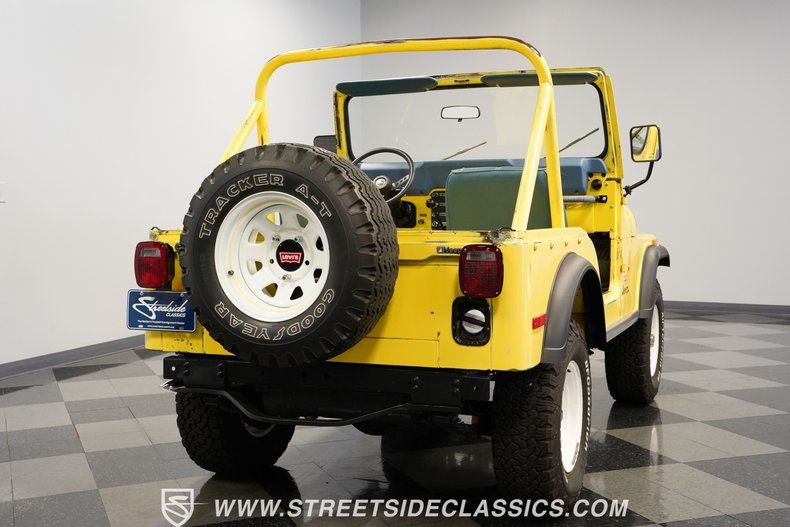 Adventure awaits with this authentic documented Levi Edition from the factory, this 1978 Jeep CJ5 Renegade Levi Edition in Sunshine Yellow paint that's been carefully preserved with original patina and clear coat protection. The 15" wheels wrapped in 30x9.50R15LT BF Goodrich All Terrain tires are built for tackling trails and exploring backcountry terrain, while the custom blue bikini top opens up endless possibilities for wind-in-your-hair fun. Yellow pin-striping accents all five wheels, and the original decals remain intact on what's clearly a trail-ready survivor.