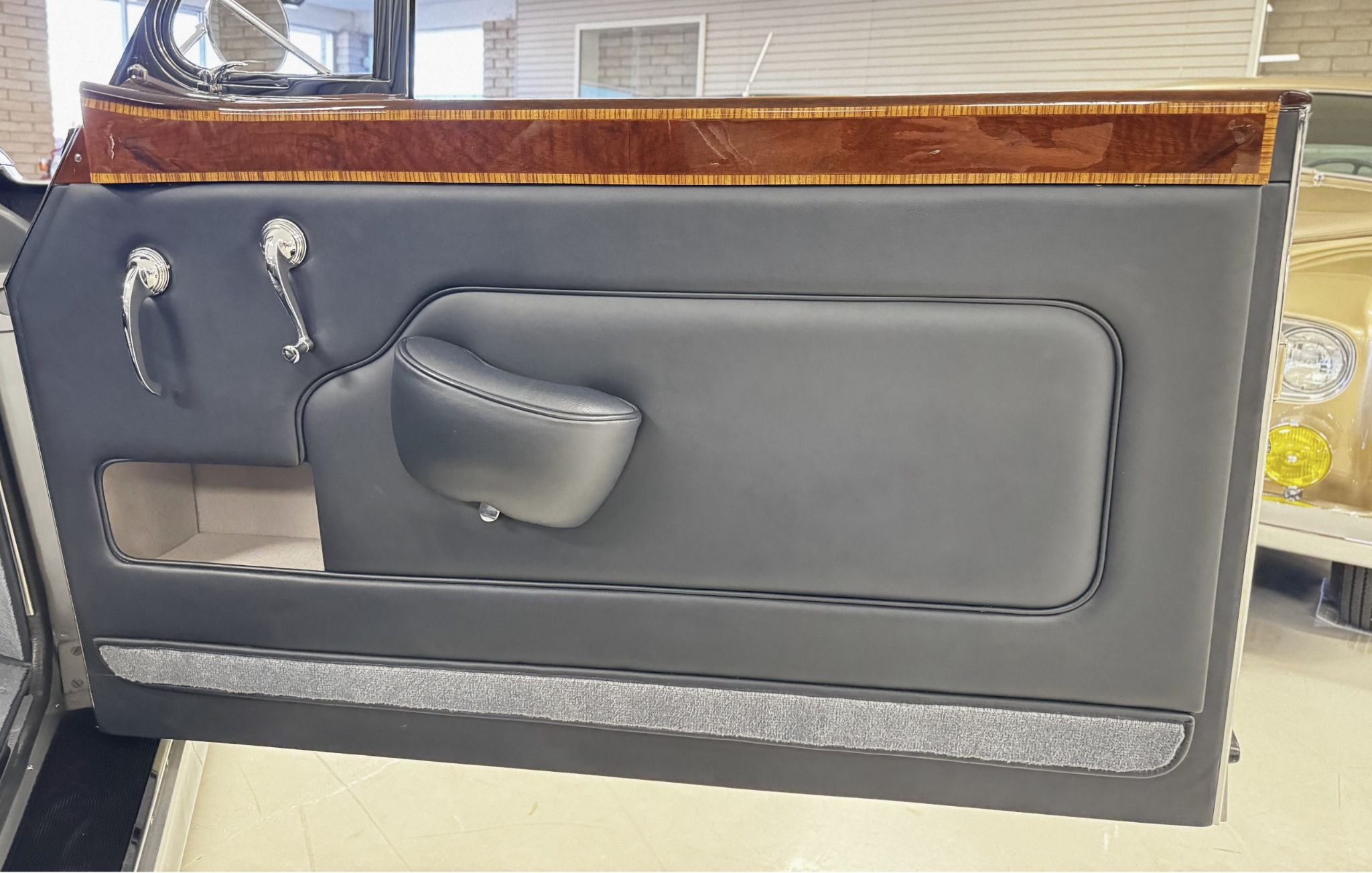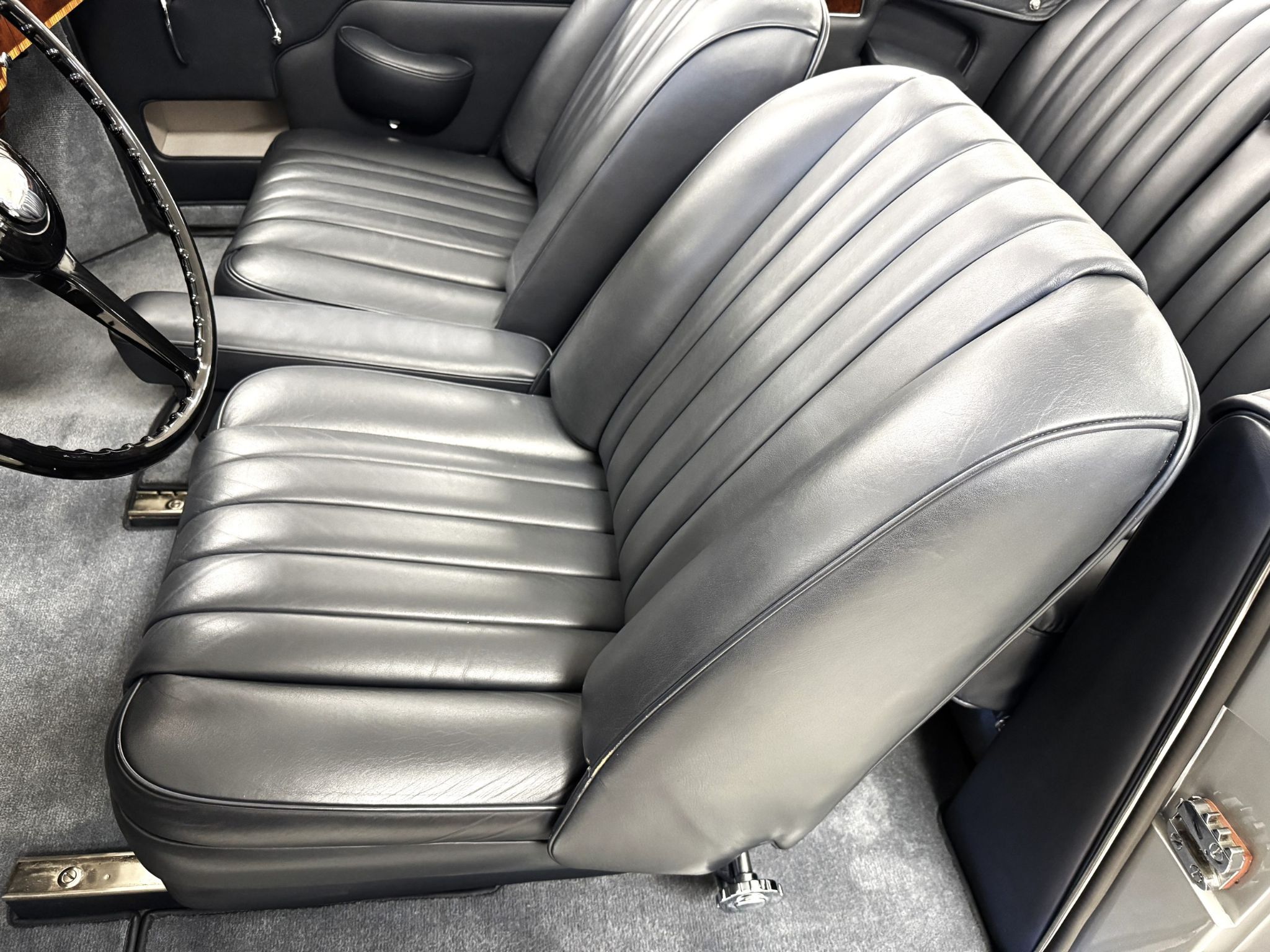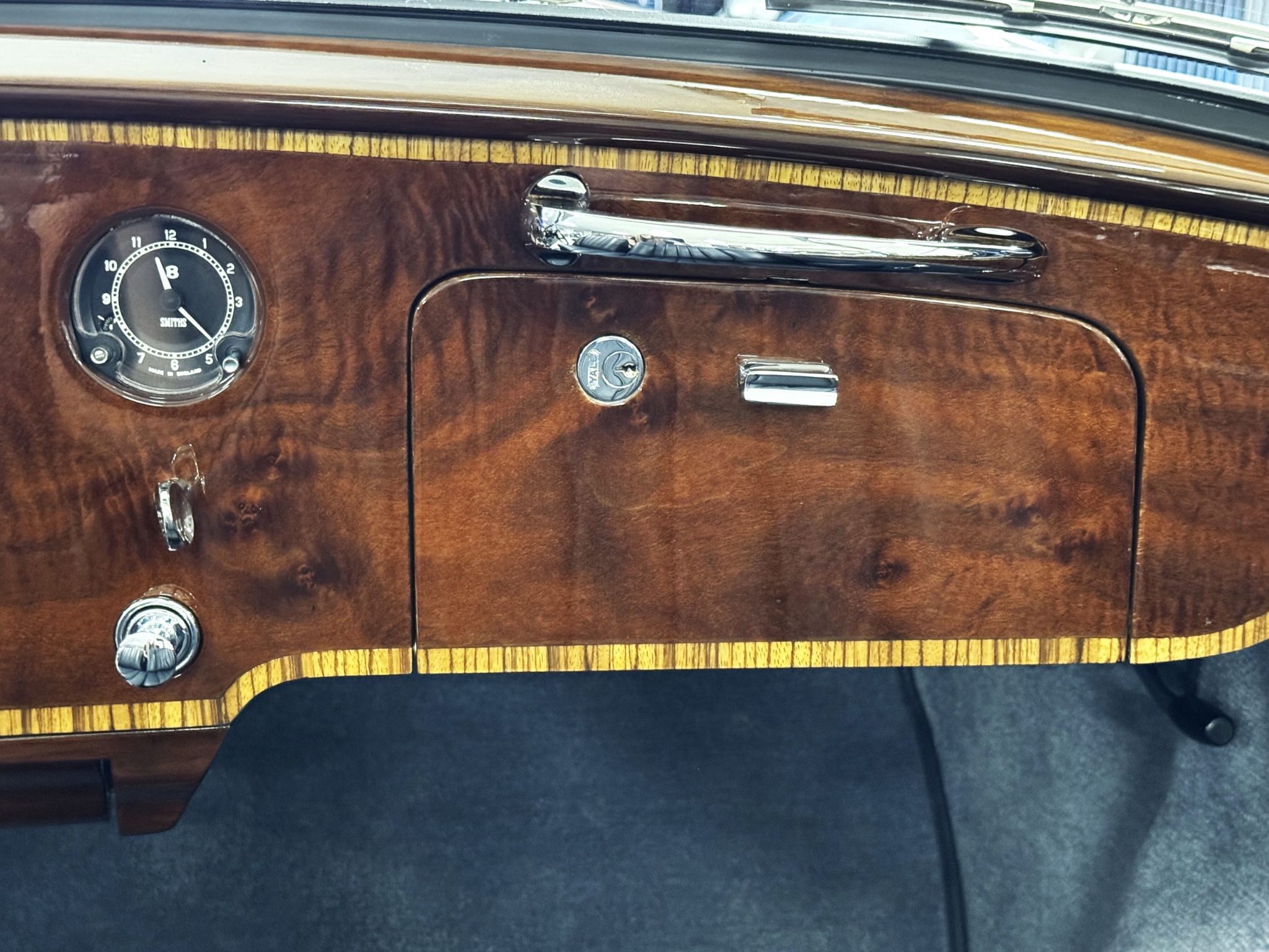 The beautiful interior features Dark Blue Connolly leather that is in excellent showroom condition. Park Wards famous burl walnut and light crossband woodwork is gorgeous and appears perfect. The complementary Light Grey Wilton wool carpet is in excellent condition. During restoration, AC was installed with vents in the rear behind the backseat. All of the instrumentation and original AM radio are in excellent condition.