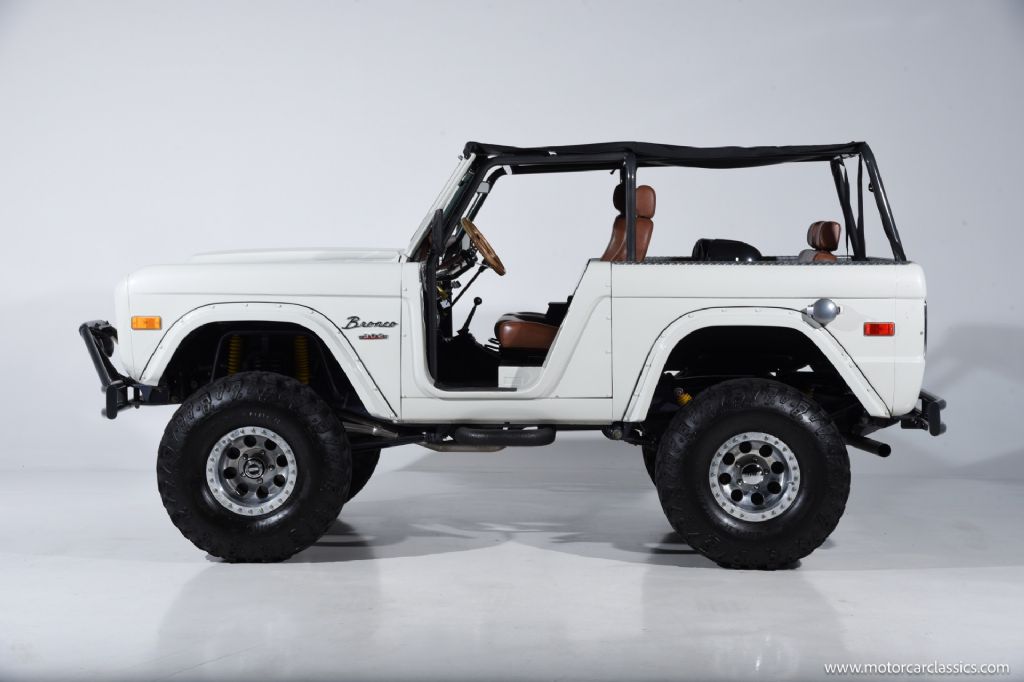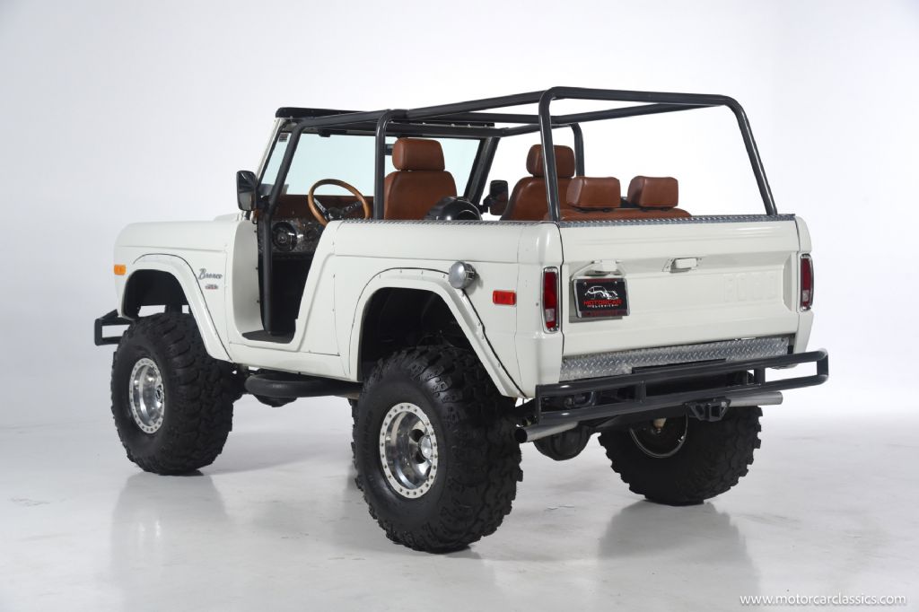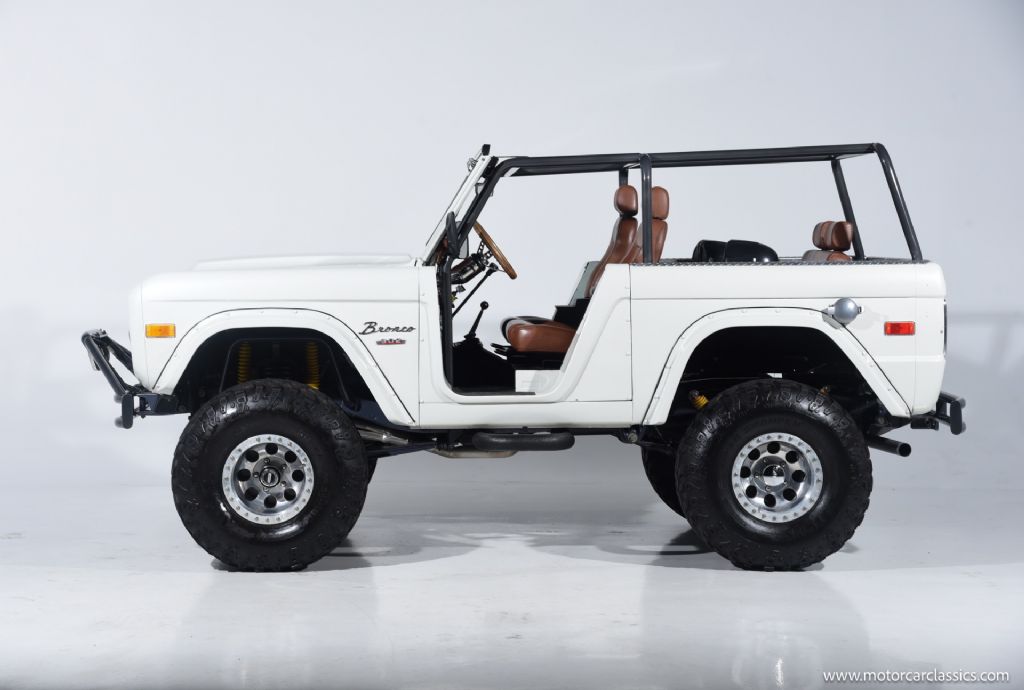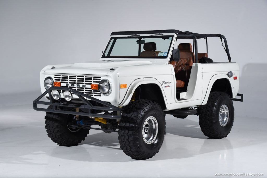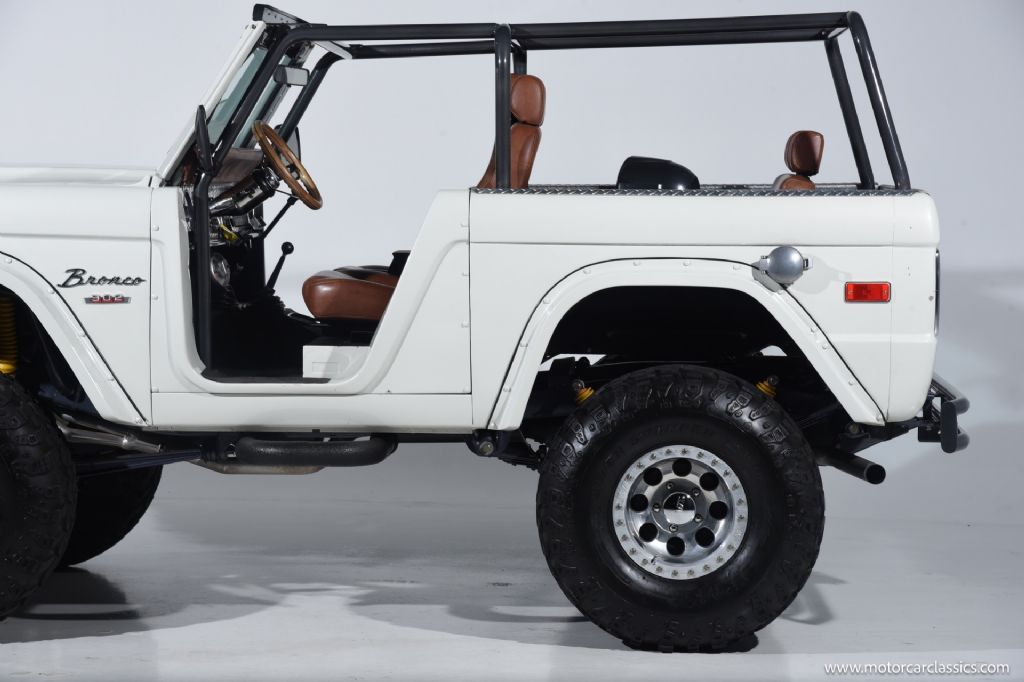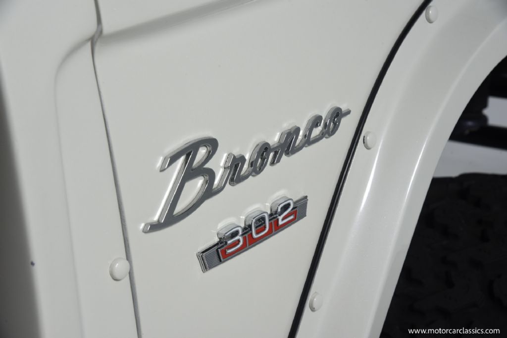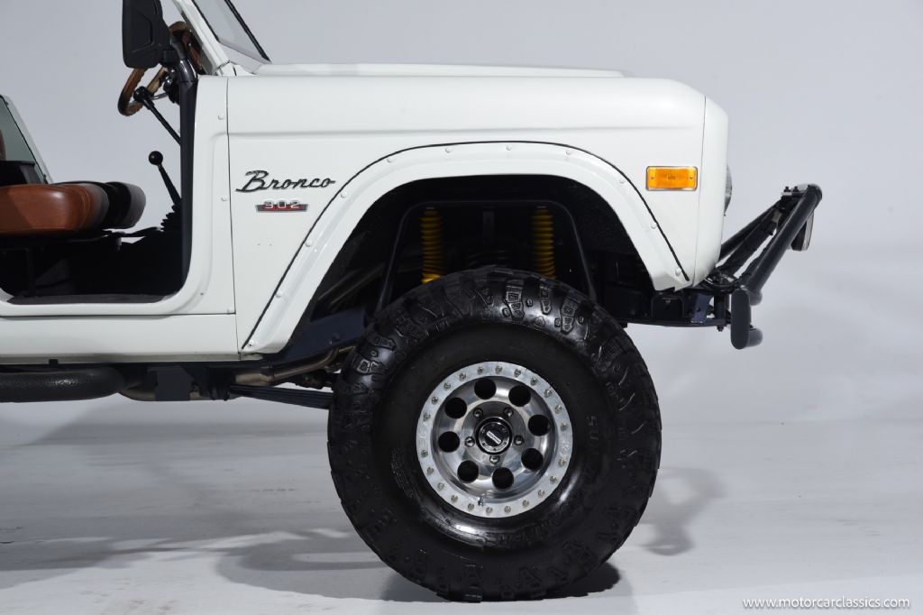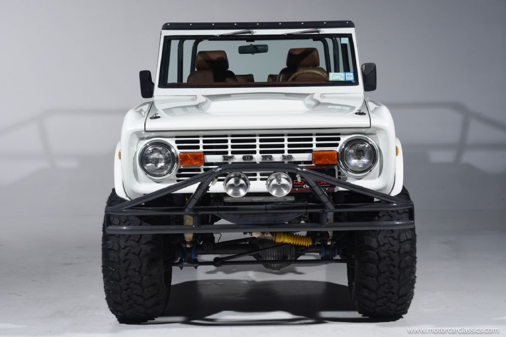 1974 Ford Bronco for sale! Motorcar Classics is pleased to offer this Bronco presented in Wimbledon White with Cognac interior. 6962 miles. Equipped with a 302ci V8 engine and 5 speed manual transmission with 4WD. This Bronco was subject to a frame off restoration. Upgrades include: Edelbrock intake, Edelbrock four-barrel carburetor, Flaming River steering shaft, dual front shocks, Autometer Pro Comp gauges, MSD ignition, aluminum radiator with electric fan, dual exhaust and polished Mickey Thompson wheels on 35 MT tires, waterproof Marine sound system, waterproofed flooring, electronic emergency brake, Vintage Bronco custom interior and more! Your inspection is invited.