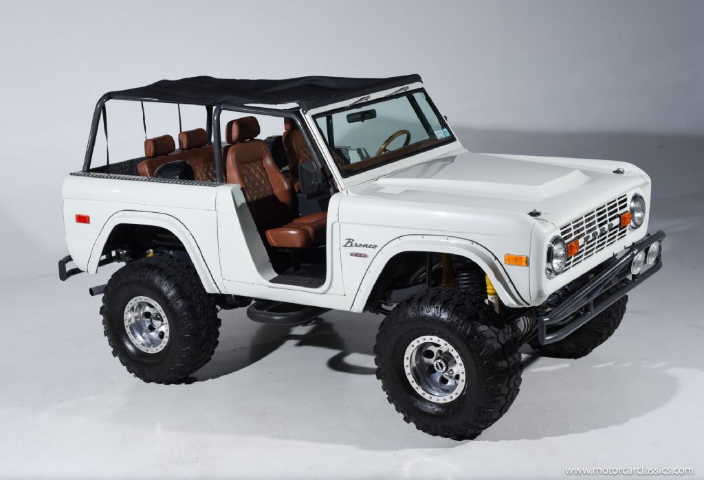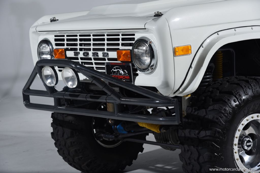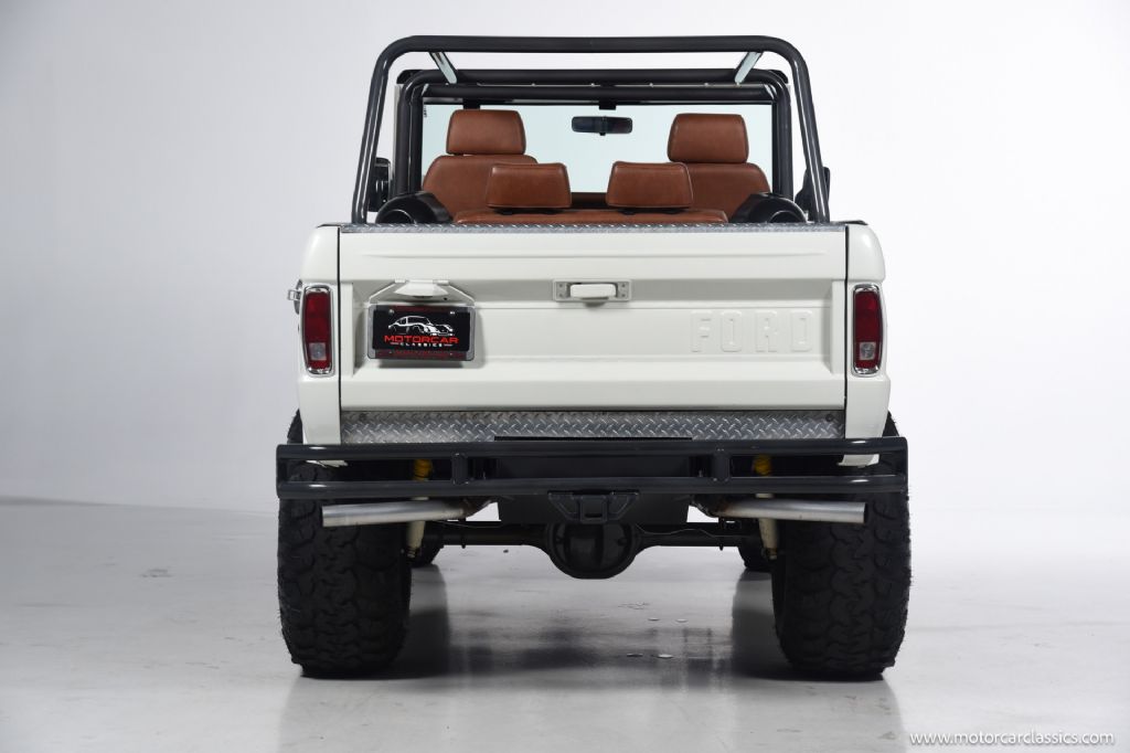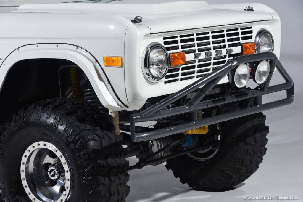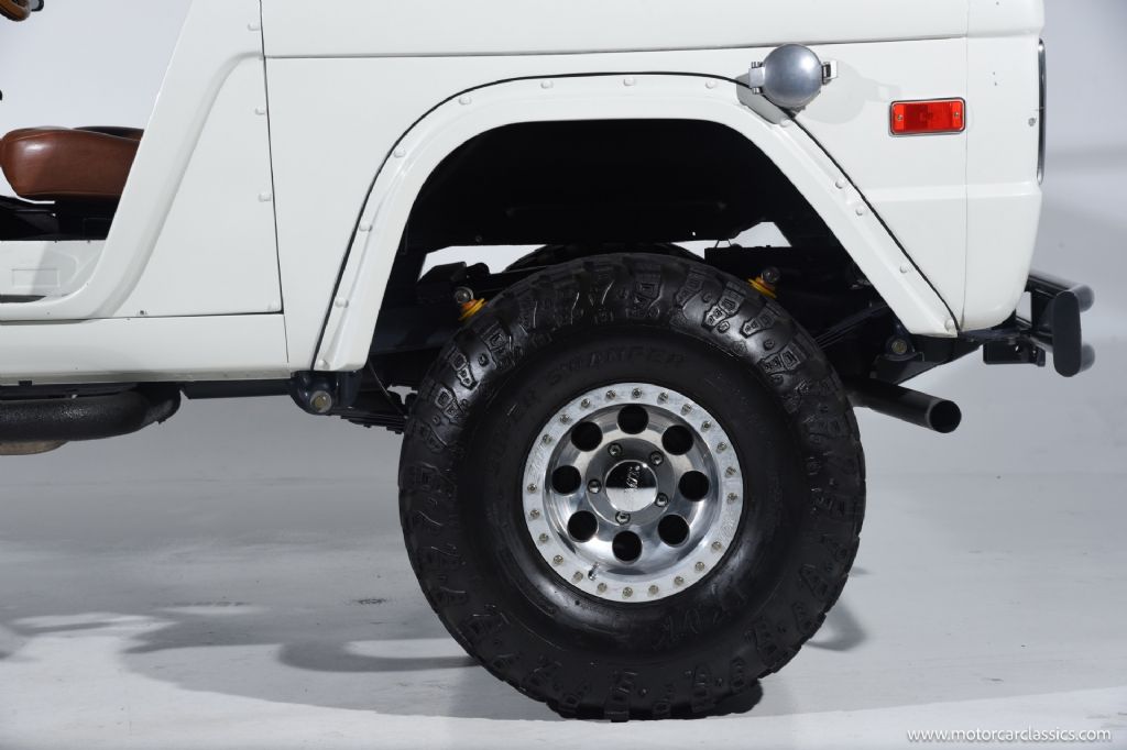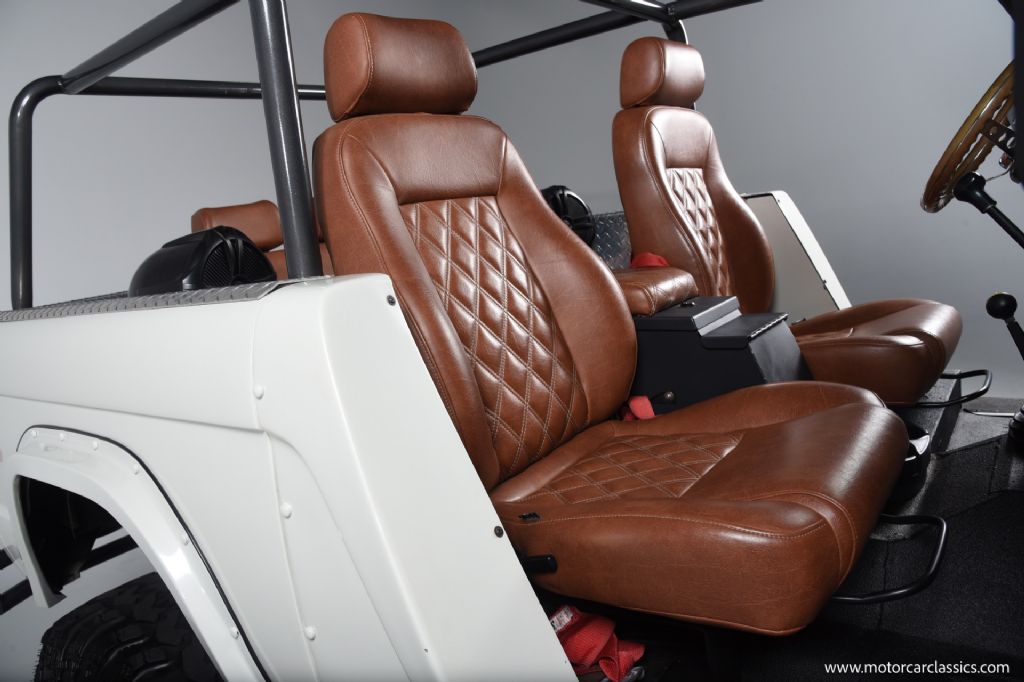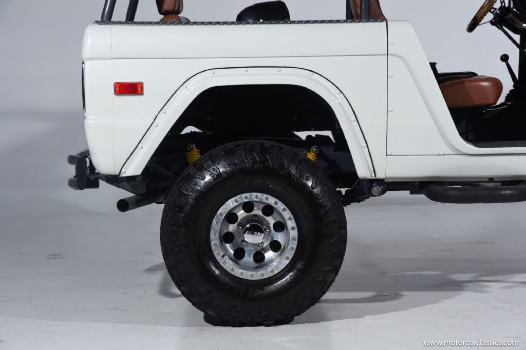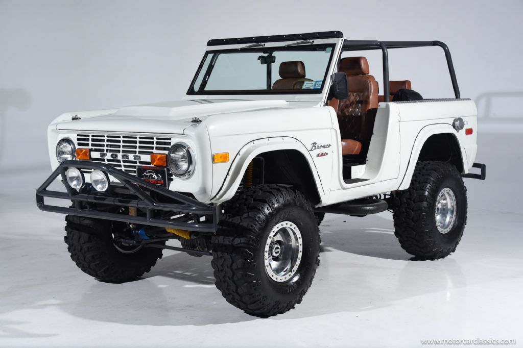 1974 Ford Bronco for sale! Motorcar Classics is pleased to offer this Bronco presented in Wimbledon White with Cognac interior. 6962 miles. Equipped with a 302ci V8 engine and 5 speed manual transmission with 4WD. This Bronco was subject to a frame off restoration. Upgrades include: Edelbrock intake, Edelbrock four-barrel carburetor, Flaming River steering shaft, dual front shocks, Autometer Pro Comp gauges, MSD ignition, aluminum radiator with electric fan, dual exhaust and polished Mickey Thompson wheels on 35 MT tires, waterproof Marine sound system, waterproofed flooring, electronic emergency brake, Vintage Bronco custom interior and more! Your inspection is invited.