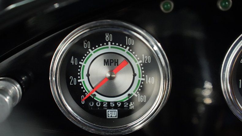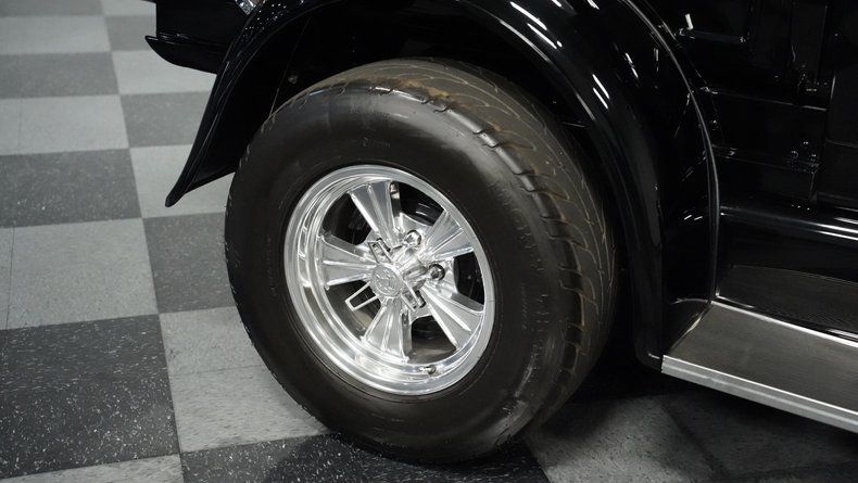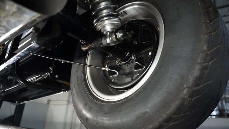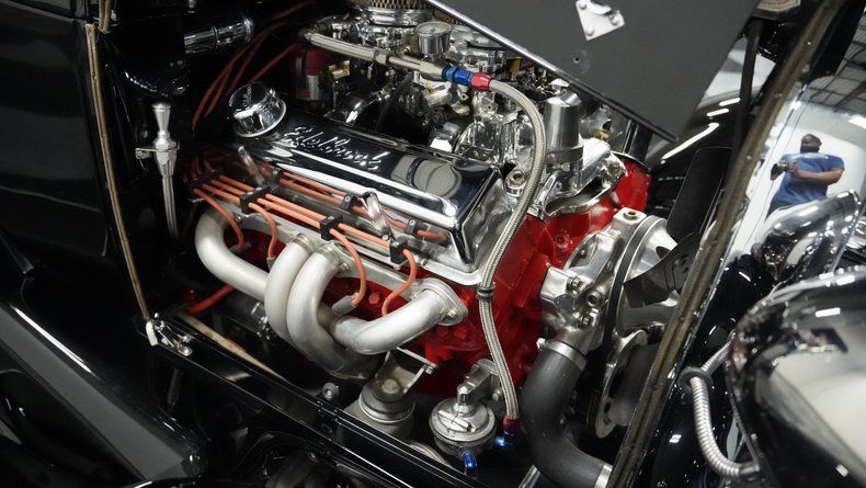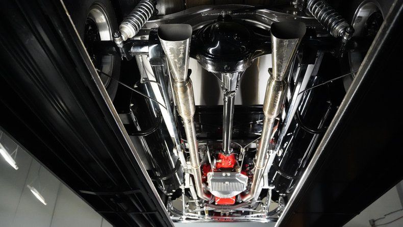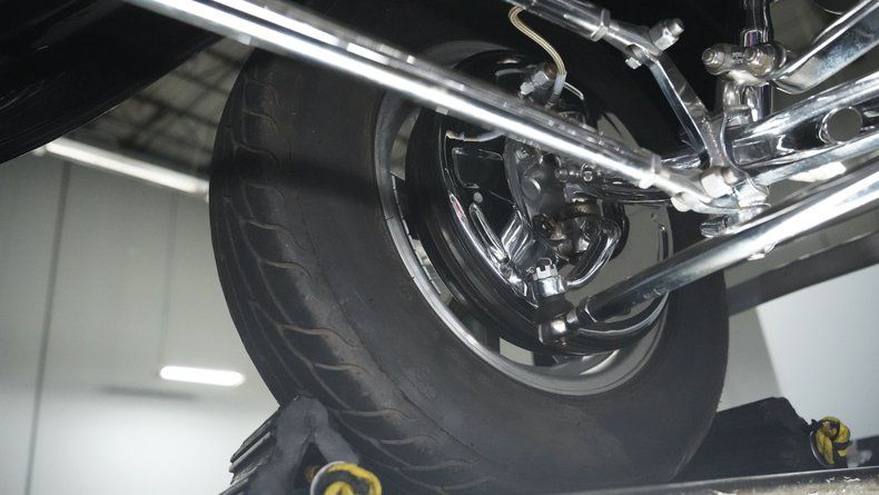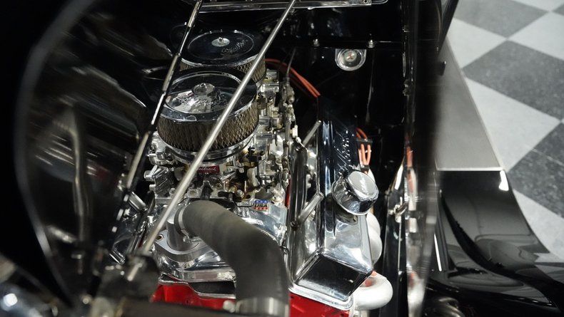 Power comes from a 283 V8 engine paired with dual 4-barrel Edelbrock carburetors and a 3-speed automatic TH350 transmission. The GM rear end features a 3rd member, while the front suspension utilizes a solid axle with monoleaf springs enhanced by fully chromed components. Ladder bars with coilovers handle the rear suspension duties. Hooker shorty headers connect to a dual exhaust system, and drum brakes provide stopping power at all four corners. The combination creates a reliable driving platform with period-appropriate performance.