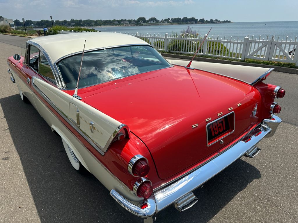 1957 DODGE CUSTOM ROYAL COUPE 325CI - 260HP 4BBL SUPER RED RAM V8 PROFESSIONAL BODY - OFF RESTORATION YEAR: 1957 MAKE: DODGE MODEL: CUSTOM ROYAL BODY: 2 - DR SPORT COUPE COLOR: RED - WHITE TWO TONE TRIM: RED CLOTH ENGINE: 325CI - 260.HP SUPER RED RAM V8 TRANS: PUSHBUTTON 3 SPEED AUTOMATIC REAR: STD MILES: 25274 (EXEMPT) SERIAL#: 37313321 OPTIONS *325CI SUPER RED RAM V8 *3 SPEED AUTOMATIC TRANS *RADIO *REAR ANTENNA *REAL WIRE WHEELS *WIDE WHITE WALL RADIAL TIRES DOCUMENTATION COMPLETE PROFESSIONAL RESTORATION PHOTOS FROM BEGINNING TO THE END *OWNERS MANUAL COMMENTS PLEASE LOOK AT ALL THE PHOTO S OF THIS CAR CLOSELY. THE ATTENTION DETAIL OF WORK IS AMAZING. OTHER THAN A NEW SEAT CUSHION, WHICH WE ARE LOCATING, THIS CAR IS SPECTACULAR LOOKING AND PERFORMS JUST AS GOOD. OVER $100,000 INVESTED.