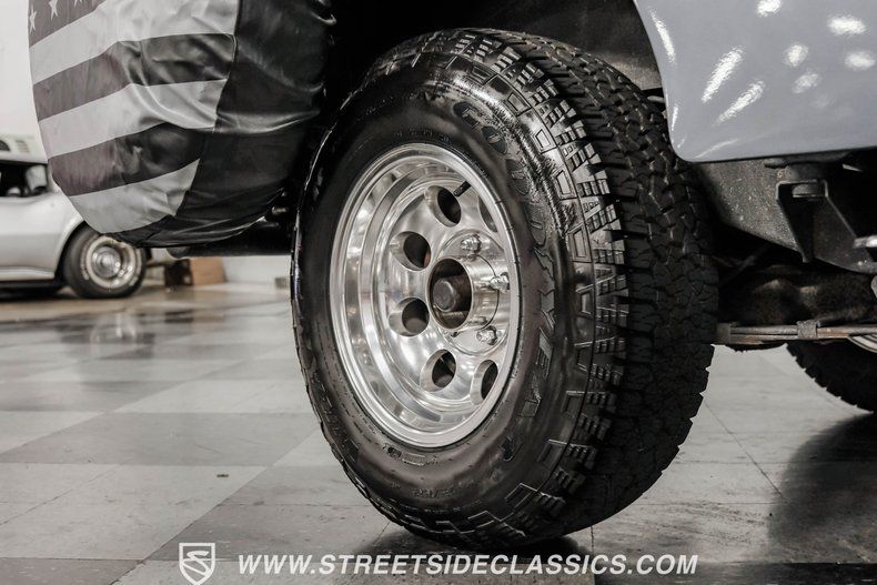 Just like the perfect pair of Levi jeans, the 1976 Jeep CJ5 embodies the spirit of American freedom and adventure. This CJ5 is equipped with 15-inch aluminum wheels wrapped in bold 235/75R15 Goodyear Wrangler all-terrain tires, ready to conquer any terrain. It comes with both a black bikini top, while upgraded LED lights and the front fog lights are ready to pierce through the misty trails. The upgraded black tubular steel bumpers, Boar 3000-pound winch and American flag spare tire cover add to its rugged charm, making it the ultimate companion for your off-road escapades.