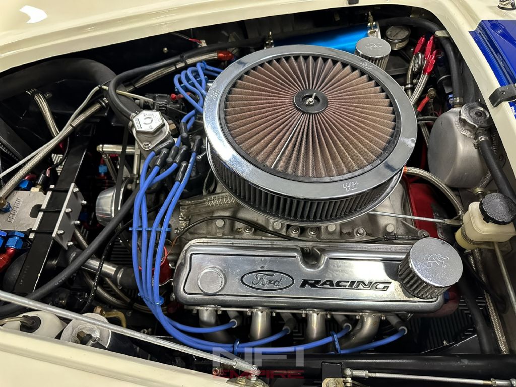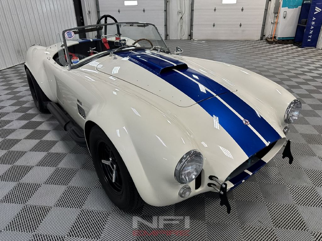 1965 Shelby Cobra MK III Superformance - the kind of car that stops people mid-stride and keeps them staring. Finished in classic white with bold blue stripes, it comes with a matching hard top for when the weather isn't as fearless as you are. Under the hood sits a 418 V8 with a dry sump oil system, fed by a Holley carb on an Edelbrock intake, breathing through a K&N air cleaner. An MSD Blaster 2 ignition keeps the spark strong, while long-tube headers feed the signature sidepipe exhaust - loud enough to make your neighbor's coffee tremble.