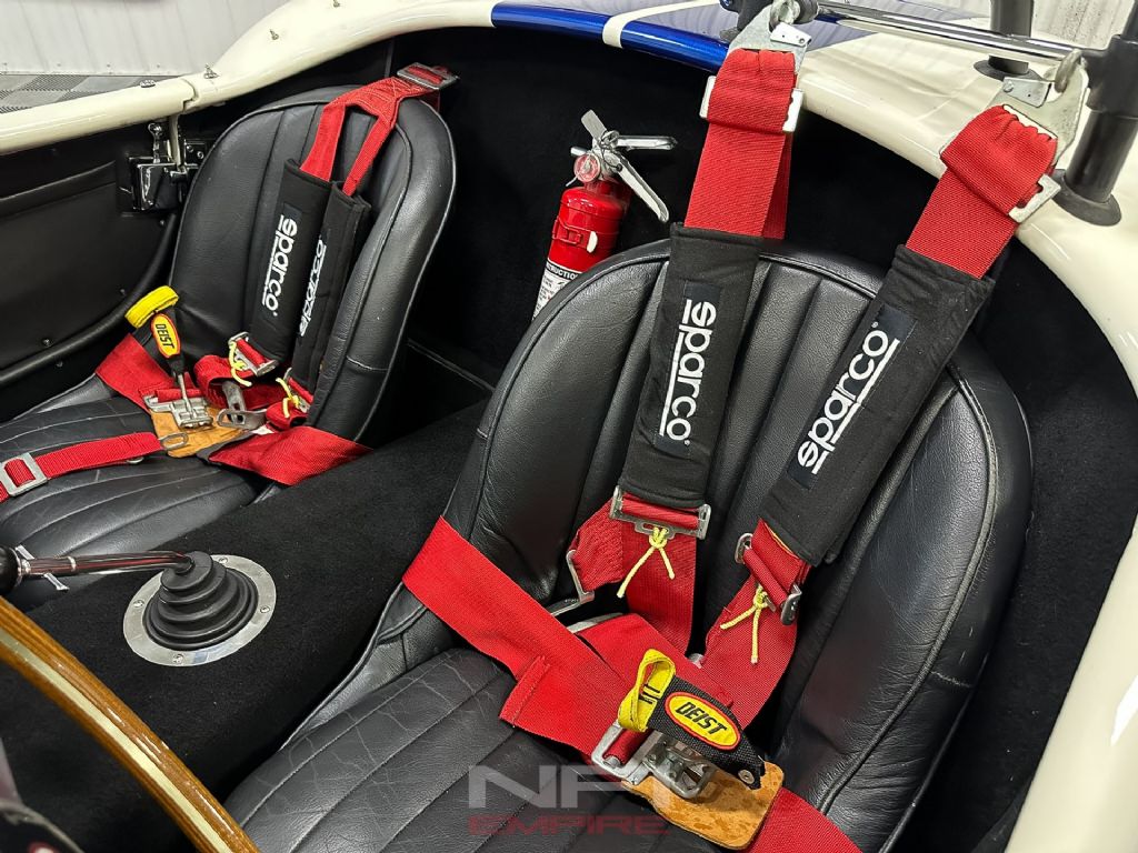 The 4-speed manual puts you in command, backed by 3.73 gears, coilovers, and sway bars front and rear to keep all that muscle pointed in the right direction. Inside, it's stripped down and purposeful: black upholstery, clean dash with clearly labeled switches, classic Smiths gauges, and Diest racing harnesses to keep you planted when the road gets lively. Rolling on 15-inch wheels with 245/60 tires up front and 295/50s in the back, it has the right stance and grip to match its bite.