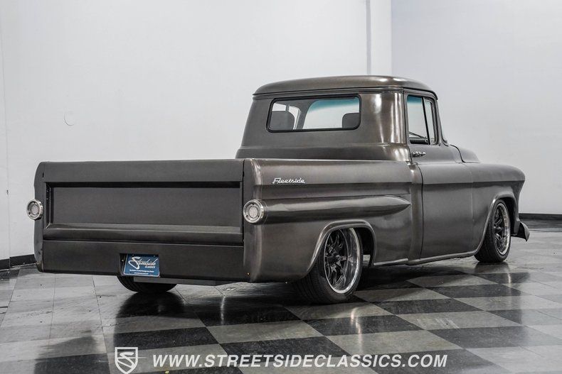 There are some vehicles that make Dark Metallic Gray look downright stunning, and this 1957 Chevrolet 3100 Fleetside is one of them. Sitting on perfectly sized 17-inch black Ridler rims and paired with a sleek black interior, this '57 is every bit the mean cruising machine. Custom touches throughout make it a true one-of-a-kind ride. The bed has been given a full coat of liner paint, giving you the option to haul cargo without worrying about scratching the paint. Out back, a smooth roll pan replaces the traditional bumper for a clean, modern finish.
