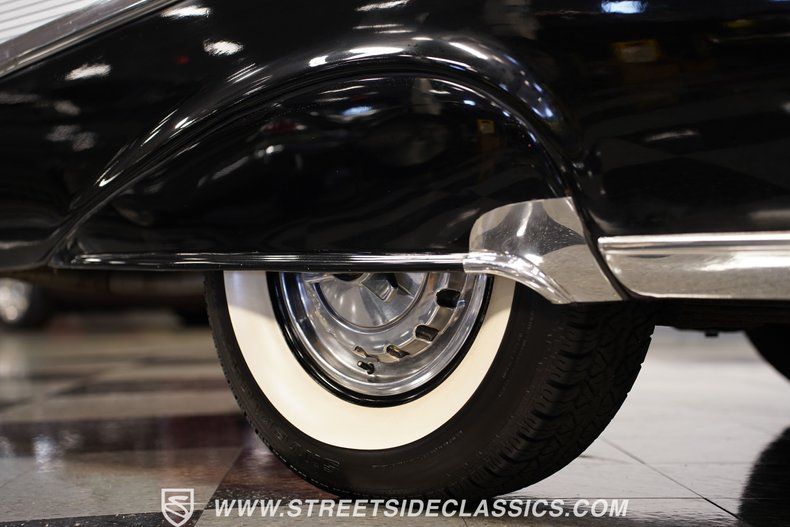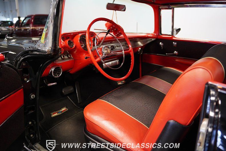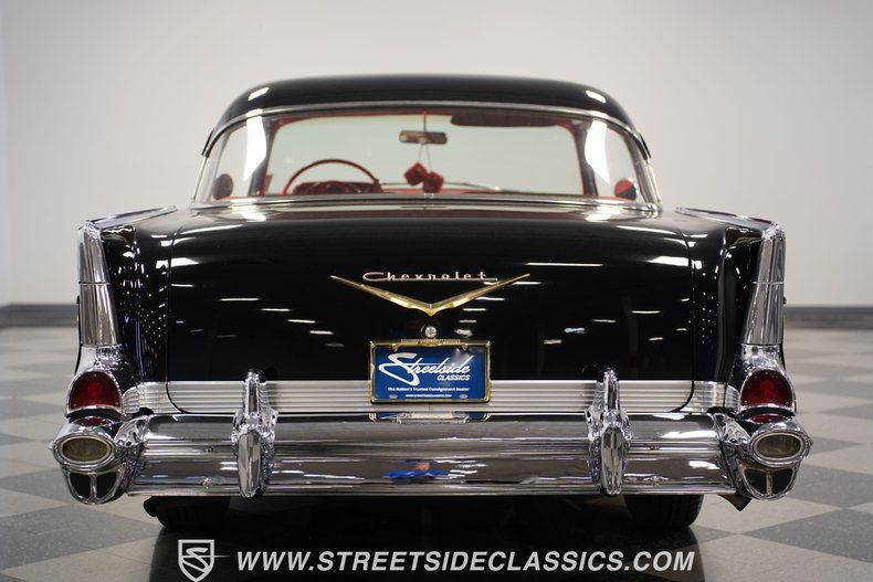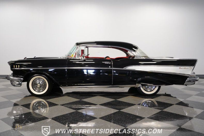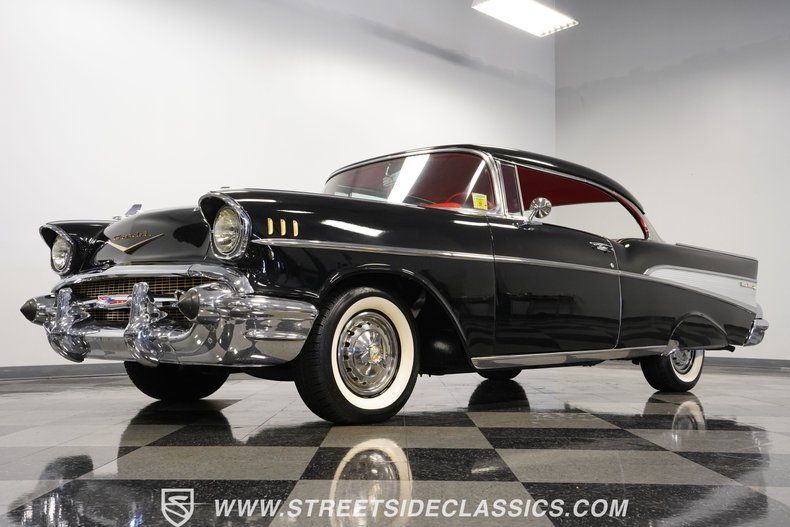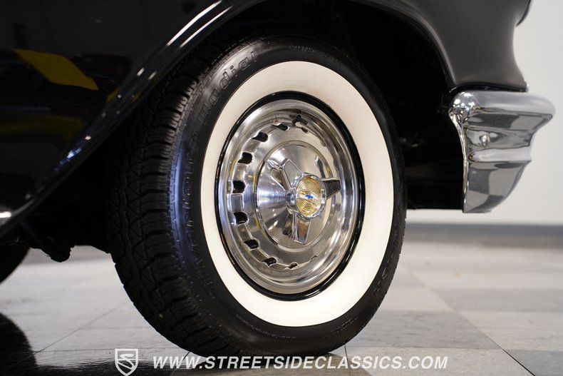 Finished in deep Onyx Black, this 1957 Chevrolet Bel Air looks sharp and is loaded with factory options. The glass-like paint job throws back light like a mirror, making the chrome bumpers, grille, and trim pop against the dark background. Gold Chevrolet, Bel Air, and "V" badges tell you this is no ordinary '57. The stance is perfect, sitting on 14" steel wheels wrapped in Silvertown radial white wall 205/75R14 tires and topped with factory Chevrolet deluxe spinner wheel covers. Exterior accessories include fender skirts, front and rear bumper guards, both left and right-side mirrors and ribbed trunk lid molding.