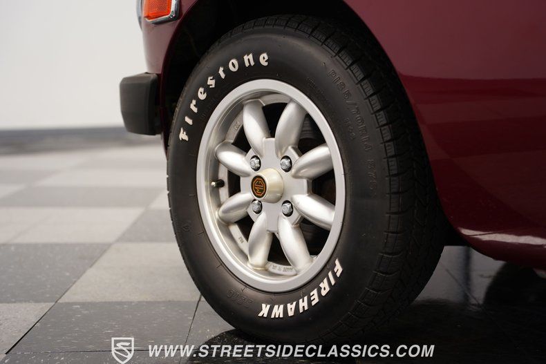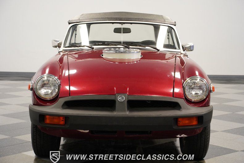 Painted red, this 1975 MG MGB displays the compact dimensions and low profile that made British roadsters famous. The body features clean lines and a tight black vinyl convertible top. A modified hood contains a cutout for the air cleaner, adding character to the front end. Chrome bumpers and trim pieces appear throughout the body, adding contrast to the red finish. The rear includes a metal luggage rack mounted to the boot lid. Completing the exterior look are 14" wheels shod with P185/70R14 tires, maintaining the traditional MG appearance that car buyers have appreciated for decades.