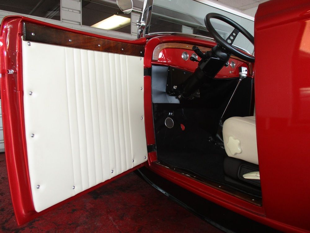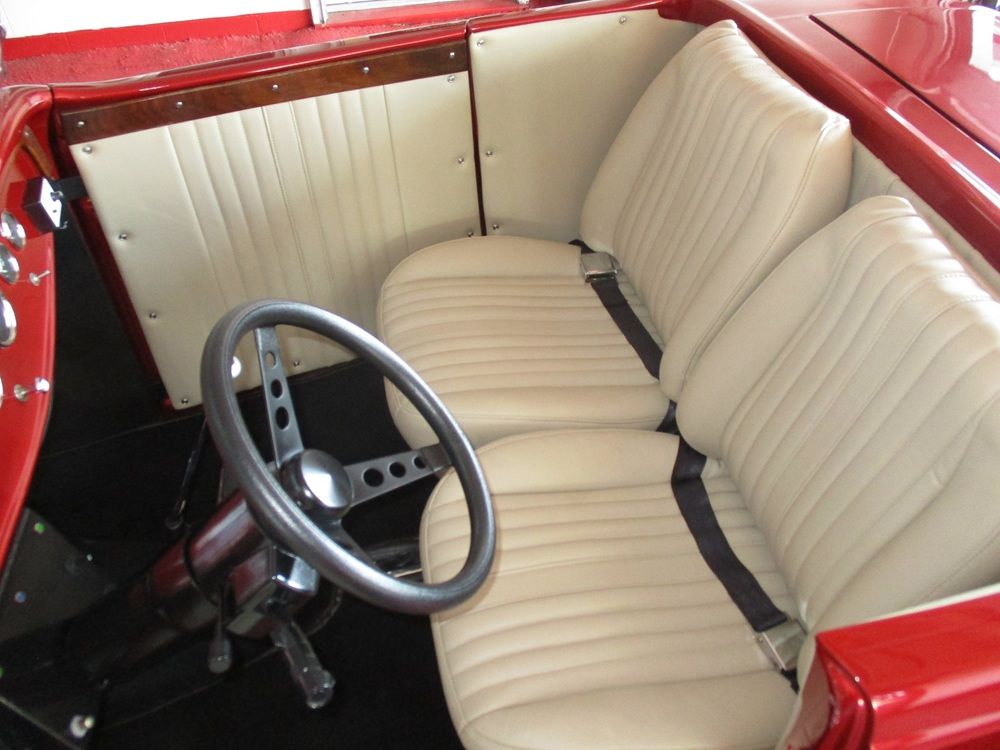 In 1932 Ford revealed a whole new line-up of vehicles. The model B was offered in 7 different body styles and only ran for 3 model years with 1934 being the last. This particular example is a 2-door roadster also referred to as a Highboy. It was produced by TRC Auto who’s mold stretched it 2” and it is finished a gorgeous dark red metallic paint. It has an original 1932 front axle, rear bumper (gas tank) and frame rails. It is now equipped with a Ford 9” posi rear end, coil over shocks and traction bars on the rear end and the front end has a reversed axle, torsion bars, stabilizer bars, chrome shocks and power disc brakes. You will also find a fuel cell and the battery in the trunk with a disconnect under the dash. The heart of this sweet street rod is a 350ci crate engine rated at 350hp that is fed via an Edelbrock 4bbl 750cfm carb with electric choke and an Edelbrock Performer intake. Spark is handled with an electronic ignition, it has ceramic coated shorty headers and it sounds awesome ripping through its 2.5” stainless steel dual exhaust. It is very nicely dressed up with chrome valve covers, a chrome water pump, a chrome radiator overflow and a chrome alternator. It also has billet aluminum pulleys, spark plug wire guides and alternator brackets. Power is put to the 9” rear end via a 700R4 tranny that is shifted by a Speedway shifter and is equipped with a B&M converter lock-up. It has a full leather interior with 6-way power seats that is cream in color and looks amazing. It is equipped with VDO gauges, tilt steering and blinkers. It has a gorgeous 1932 grill with chrome trim and Ford logos, the chrome headlights have blinkers built in, it has a gorgeous chrome windshield that tilts and holds the chrome mirrors as well as the sweet chrome auxiliary lights. It is finished with a gorgeous set of American Racing Torque Thrust Ds wrapped in staggered BF Goodrich Radial T.A.’s that pull the whole look together. It is titled as a 1992 Ford with a 17-digit VIN. Close to $50,000 was spent to build this sweet Highboy and it only has 249 miles on it. We have priced it aggressively so if you like what you see time is of the essence!